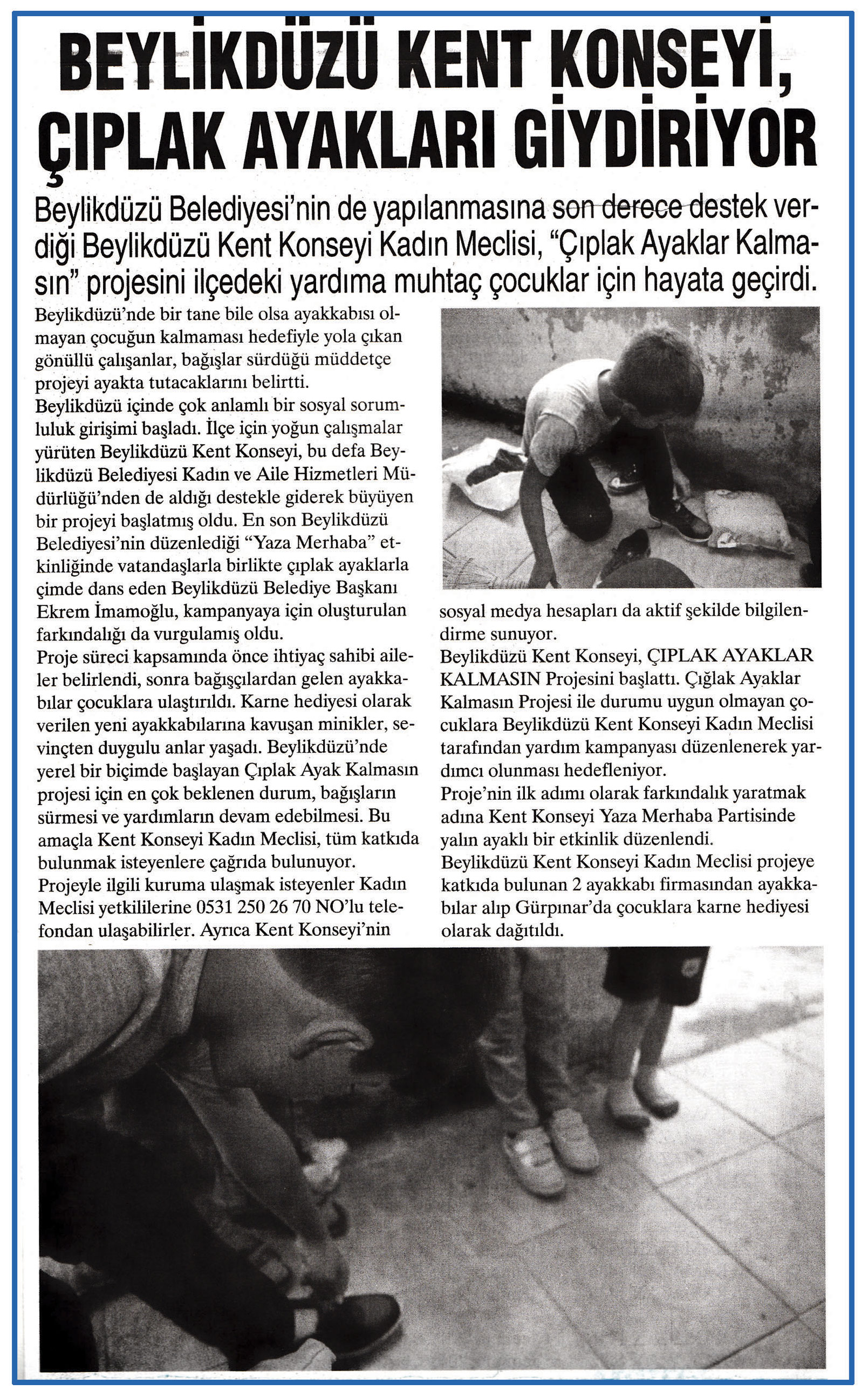 18 Haziran 2015 tarihli "BÜYÜÇEKMECE" gazetesi. Beylikdüzü Belediyesi'nin de yapılanmasına son derece destek verdiği Beylikdüzü Kent Konseyi Kadın Meclisi, " Çıplak Ayaklar Kalmasın" projesini ilçedeki yardıma muhtaç çocuklar için hayata geçirdi.