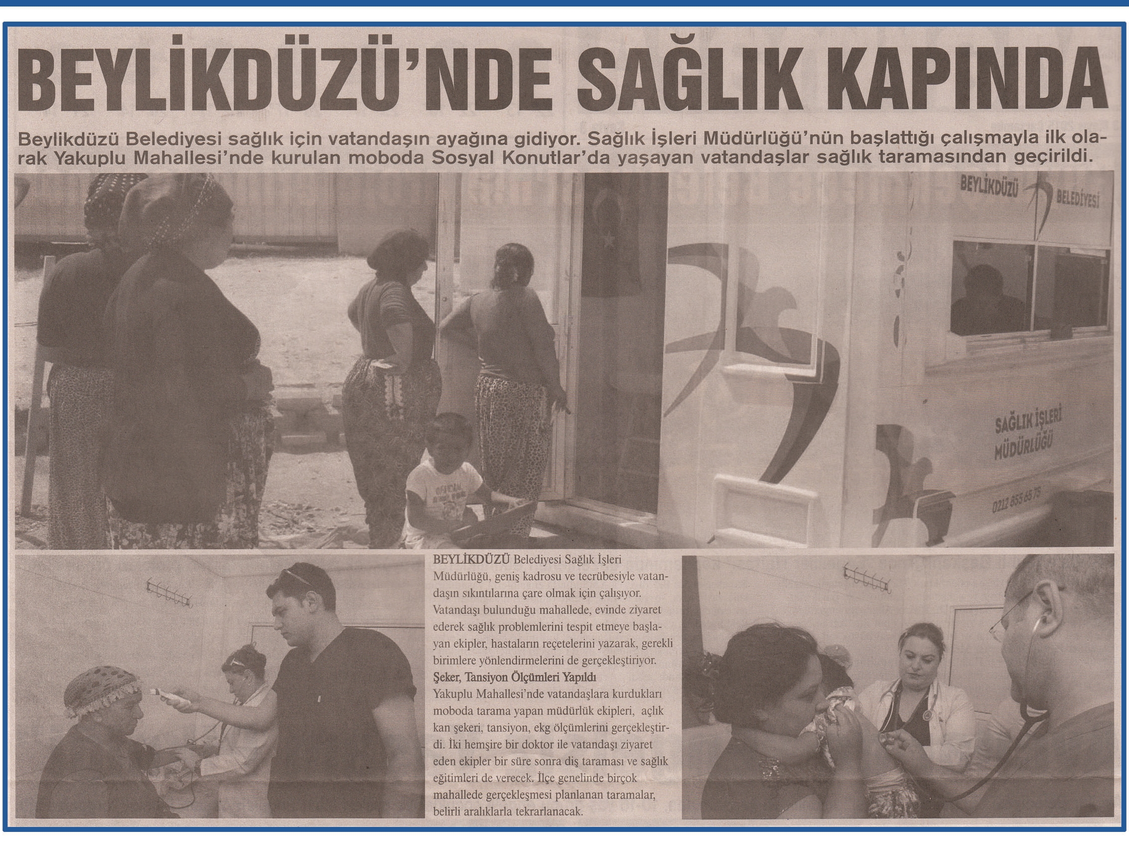 13 Mayıs 2015 tarihli ''MARMARA'' gazetesi. Beylikdüzü Belediyesi sağlık için vatandaşın ayağına gidiyor.Sağlık İşleri Müdürlüğü'nün başlattığı çalışmayla ilk olarak Yakuplu Mahallesi'nde kurulan moboda Sosyal Konutlar'da yaşayan vatandaşlar sağlık taramasından geçirildi.