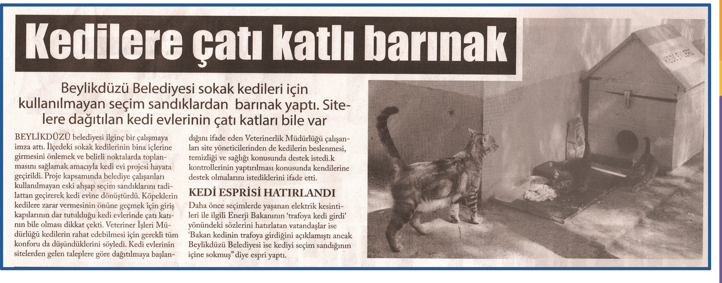 14 Mayıs 2015 tarihli ''BÜYÜK TAKİP'' gazetesi. Beylikdüzü Belediyesi sokak kedileri için kullanılamayan seçim sandıklardan barınak yaptı.Sitelere dağıtılan kedi evlerinin çatı katları bile var