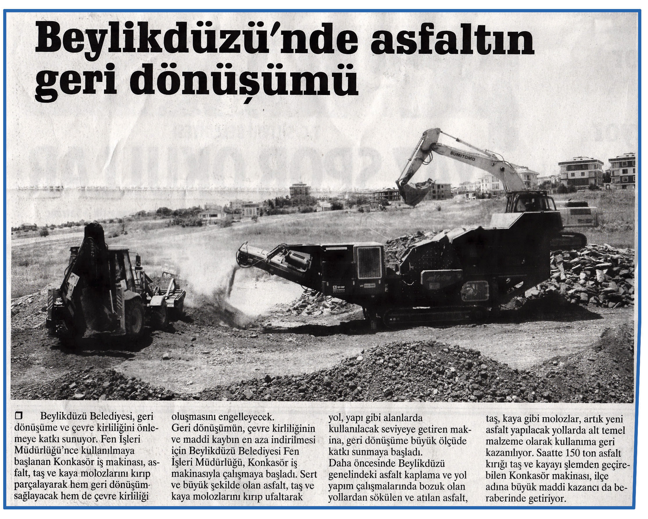 19 Haziran 2015 tarihli "FARK" gazetesi. Beylikdüzü Belediyesi, geri dönüşüme ve çevre kirliliğini önlemeye katkı sunuyor. Fen İşleri Müdürlüğü'nce kullanılmaya başlanan Konkasör iş makinası, asfalt, taş ve kaya molozlarını kırıp parçalayarak hem geri dönüşüm sağlayacak hem de çevre kirliliği oluşmasını engelleyecek.