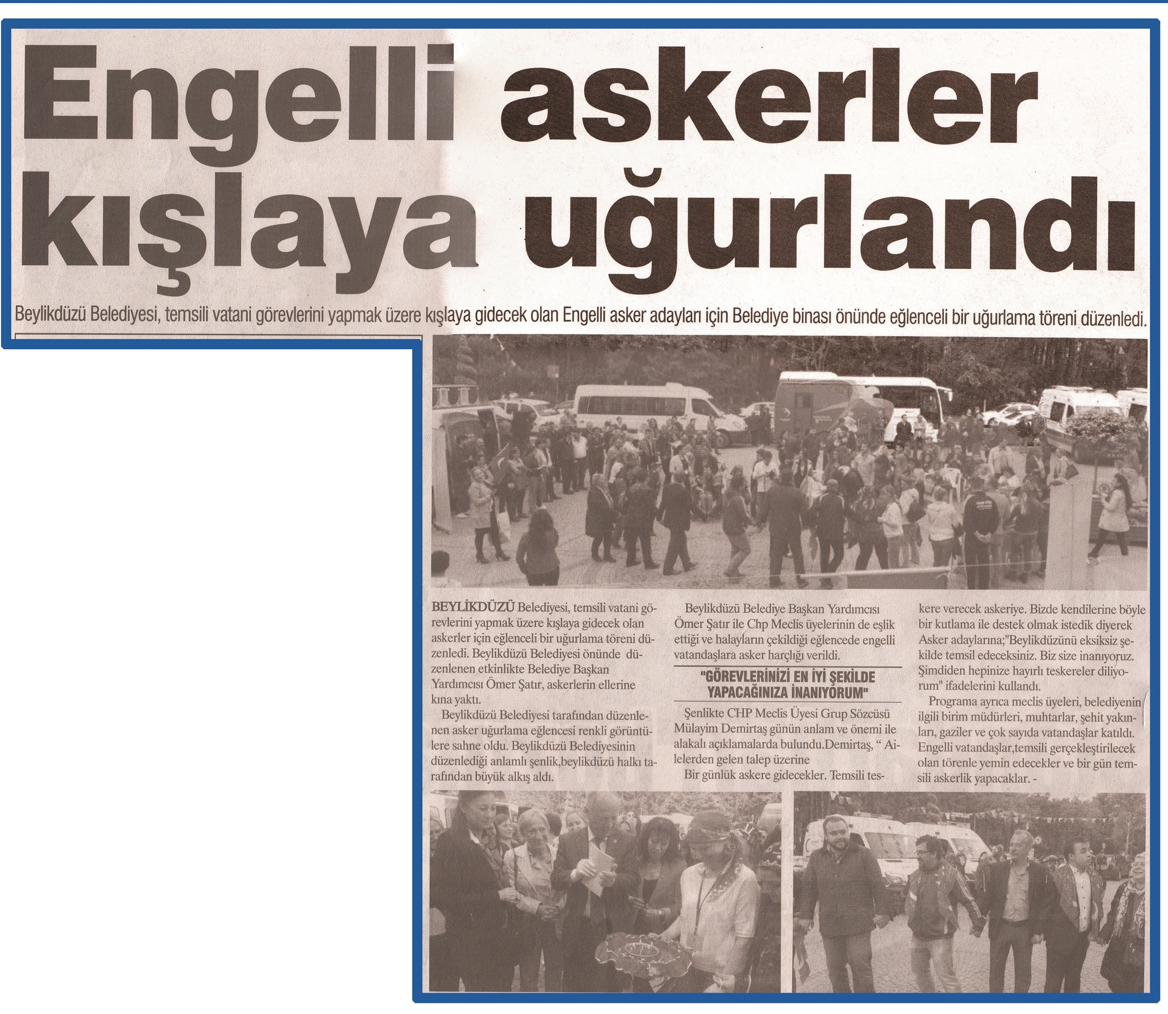 14 Mayıs 2015 tarihli ''MEDYA 34'' gazetesi. Beylikdüzü Belediyesi,temsili vatani görevlerini yapmak üzere kışlaya gidecek olan Engelli asker adayları için Belediye Binası önünde eğlenceli bir uğurlama töreni düzenledi.