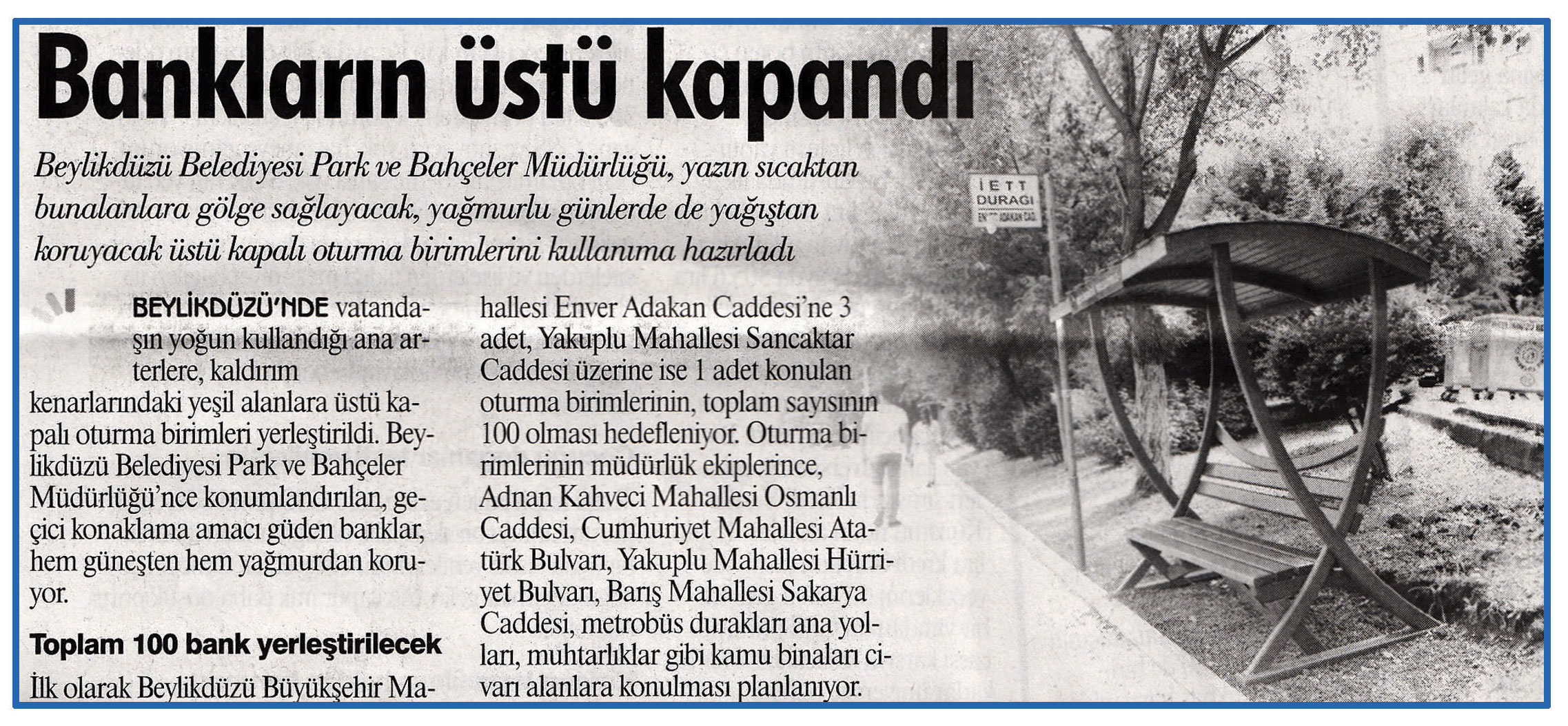 22 Haziran 2015 tarihli "GAZETE İSTANBUL" gazetesi. Beylikdüzü Belediyesi Park ve Bahçeler Müdürlüğü, yazın sıcaktan bunalanlara gölge sağlayacak, yağmurlu günlerde de yağıştan koruyacak üstü kapalı oturma birimlerini kullanıma hazırladı.
