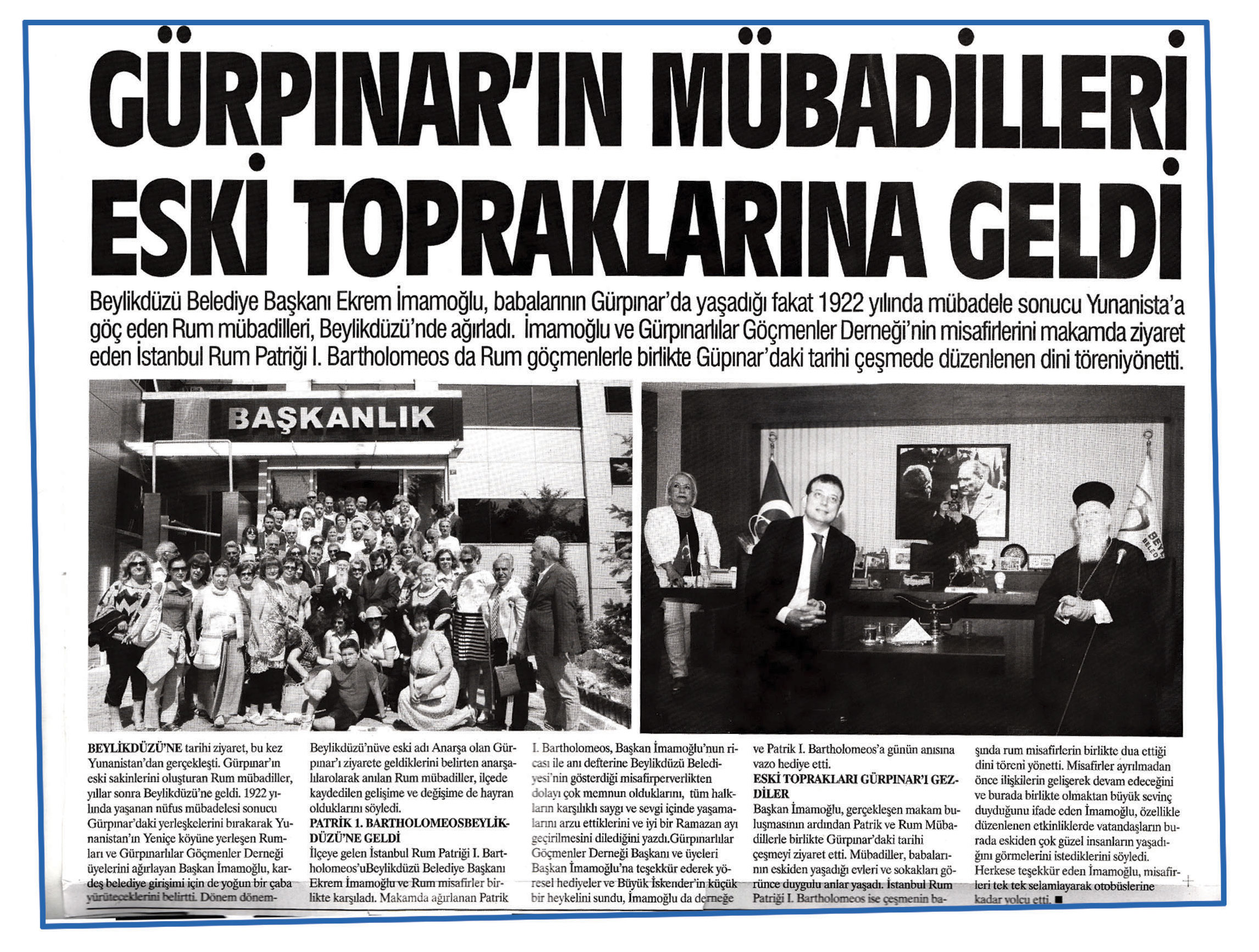 23 Haziran 2015 tarihli "YENİ GÜN" gazetesi. Beylikdüzü Belediye Başkanı Ekrem İmamoğlu, babalarının Gürpınar'da yaşadığı fakat 1922 yılında mübadele sonucu Yunanistan'a göç eden Rum mübadilleri, Beylikdüzü'nde ağırladı. İmamoğlu ve Gürpınarlılar Göçmenler Derneği'nin Misafirlerini makamda ziyaret eden İstanbul Rum Patriği I. Bartholomeos da Rum göçmenlerle birlikte Gürpınar'da ki tarihi çeşmede düzenlenen dini töreni yönetti.