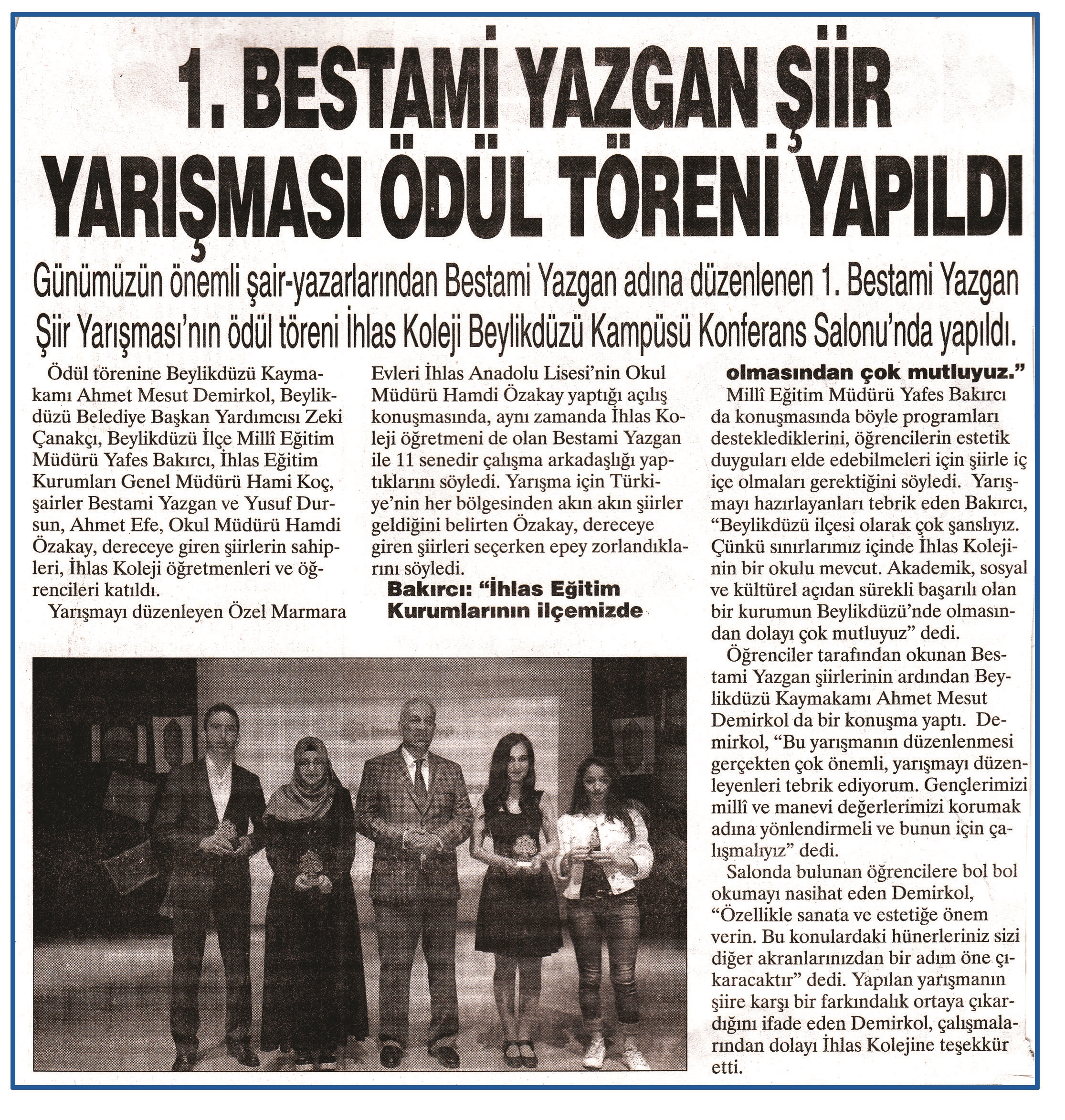18 Mayıs 2015 tarihli ''BÜYÜKÇEKMECE'' gazetesi. Günümüzün önemli şair-yazarlarından Bestami Yazgan adına düzenlenen 1. Bestami Yazgan Şiir Yarışması'nın ödül töreni İhlas Koleji Beylikdüzü Kampüsü Konferans Salonu'nda yapıldı.