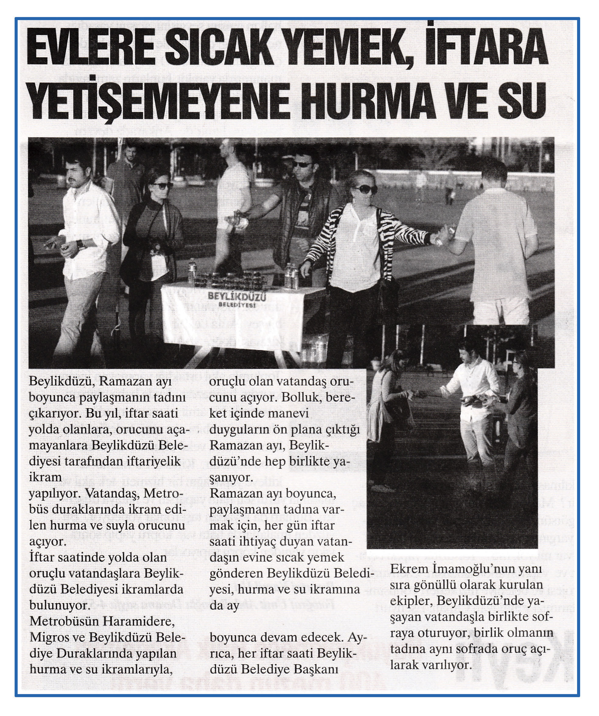 25 Haziran 2015 tarihli "HABER SİZ" gazetesi. Beylikdüzü Belediyesi tarafından iftar saati yolda olanlara, orucu açamayanlara iftariyelik ikram yapılıyor. Vatandaş, haramidere, migros ve beylikdüzü belediye metrobüs duraklarında ikram edilen hurma ve suyla orucunu açıyor.