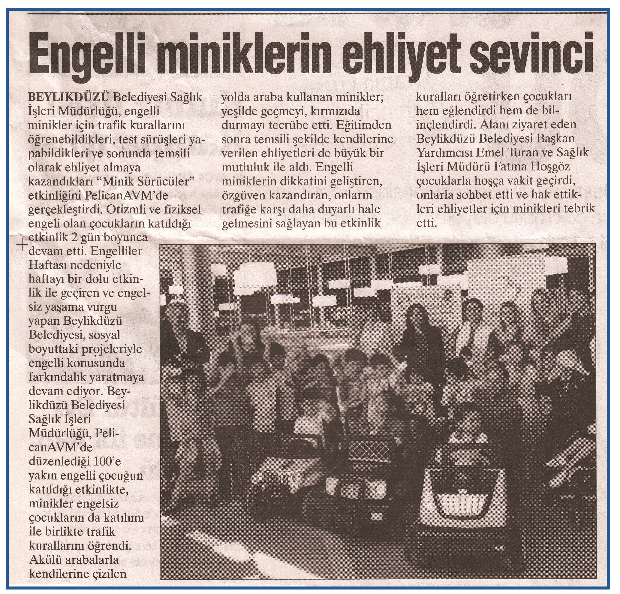 20 Mayıs 2015 tarihli ''MANŞET'' gazetesi. Beylikdüzü Belediyesi Sağlık İşleri Müdürlüğü, engelli minikler için trafik kurallarını öğrenebildikleri,test sürüşleri yapabildikleri ve sonunda temsili olarak ehliyet almaya kazandıkları ''Minik Sürücüler'' etkinliğini PelicanAVM'de gerçekleştirdi.