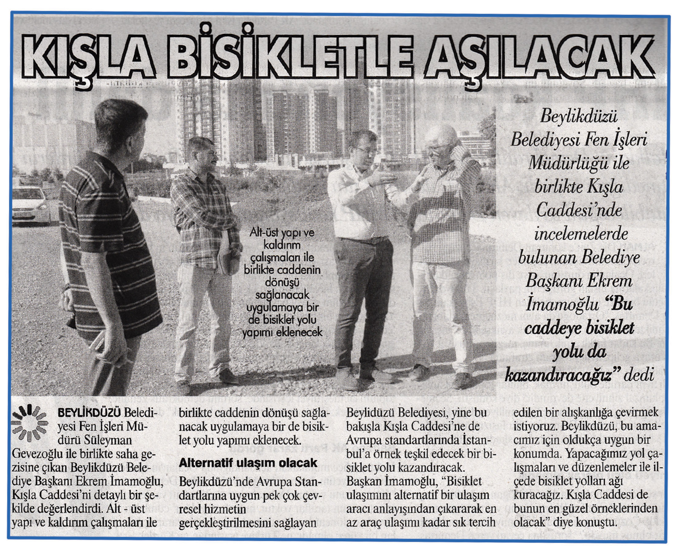 26 Haziran 2015 tarihli "GAZETE İSTANBUL" gazetesi. Beylikdüzü Belediyesi Fen İşleri Müdürlüğü ile birlikte Kışla Caddesi'nde incelemelerde bulunan Belediye Başkanı Ekrem imamoğlu "Bu caddeye bisiklet yolu da kazandıracağız" dedi.