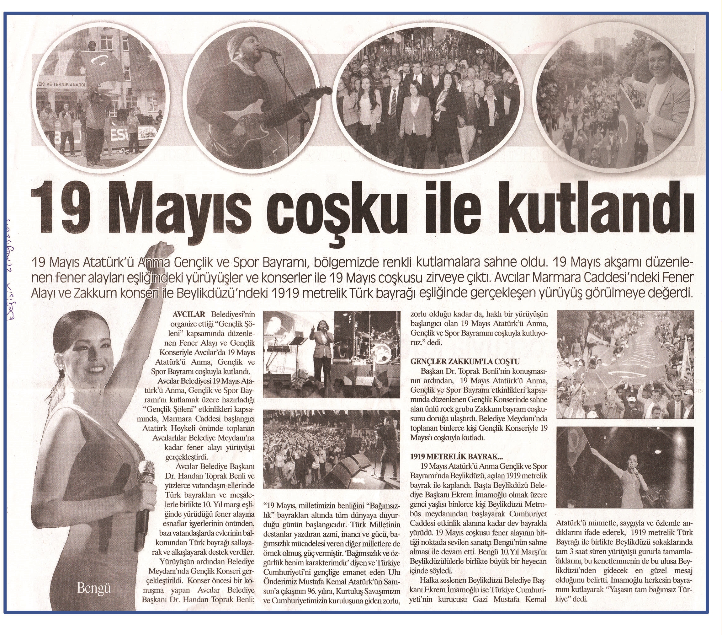 21 Mayıs 2015 tarihli ''DEĞİŞİM'' gazetesi. 19 Mayıs Atatürk'ü Anma Gençlik ve Spor Bayramı, bölgemizde renkli kutlamalara sahne oldu. 19 Mayıs akşamı düzenlenen fener alayları eşliğindeki yürüyüşler ve konserler ile 19 Mayıs coşkusu zirveye çıktı. Avcılar Marmara Caddesi'ndeki Fener Alayı ve Zakkum konseri ile Beylikdüzü'ndeki 1919 metrelik Türk bayrağı eşliğinde gerçekleşen yürüyüş görülmeye değerdi.