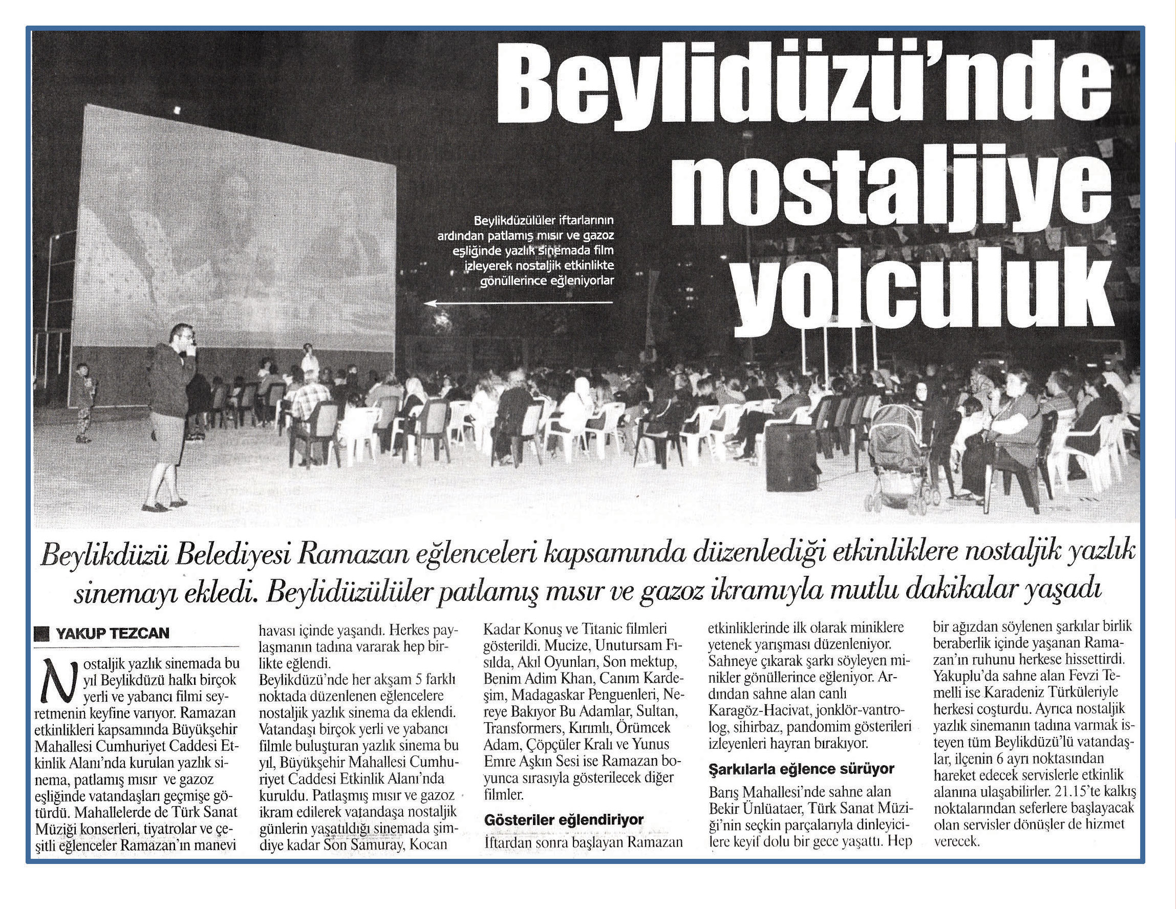 30 Haziran 2015 tarihli "GAZETE İSTANBUL" gazetesi. Beylikdüzü Belediyesi Ramazan eğlenceleri kapsamında düzenlediği etkinliklere nostaljik yazlık sinemayı ekledi. Nostaljik yazlık sinemada bu yıl Beylikdüzü halkı birçok yerli ve yabancı filmi seyretmenin keyfine varıyor. Ramazan etkinlikleri kapsamında Büyükşehir Mahallesi Cumhuriyet Caddesi Etkinlik Alanı'nda kurulan yazlık sinema, patlamış mısır ve gazoz eşliğinde vatandaşları geçmişe götürdü.