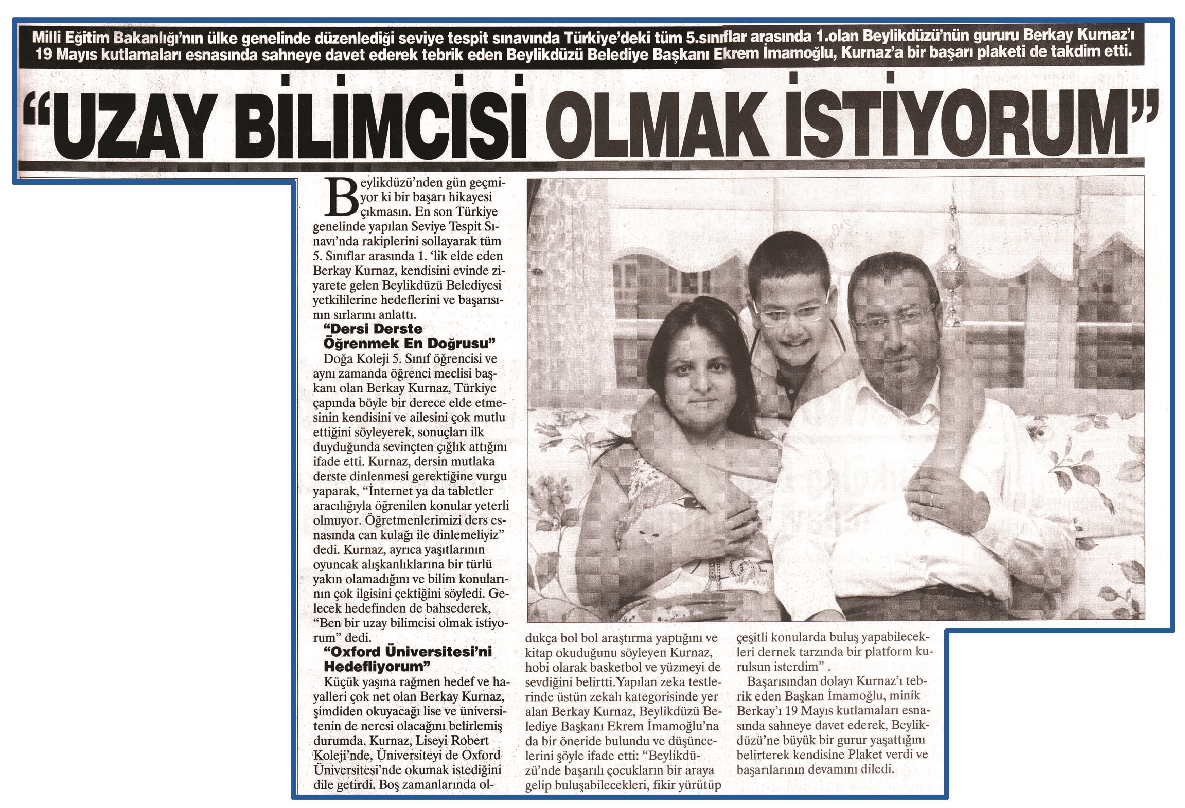 22 Mayıs 2015 tarihli ''BÜYÜKÇEKMECE'' gazetesi. Beylikdüzü'nde gün geçmiyor ki bir başarı hikayesi çıkmasın.En son Türkiye genelinde yapılan Seviye Tespit Sınavı'nda rakiplerini sollayarak tüm 5. Sınıflar arasında 1.'lik elde eden Berkay Kurnaz, kendisini evinde ziyarete gelen Beylikdüzü Belediyesi yetkililerine hedeflerini ve başarısının sırlarını anlattı.