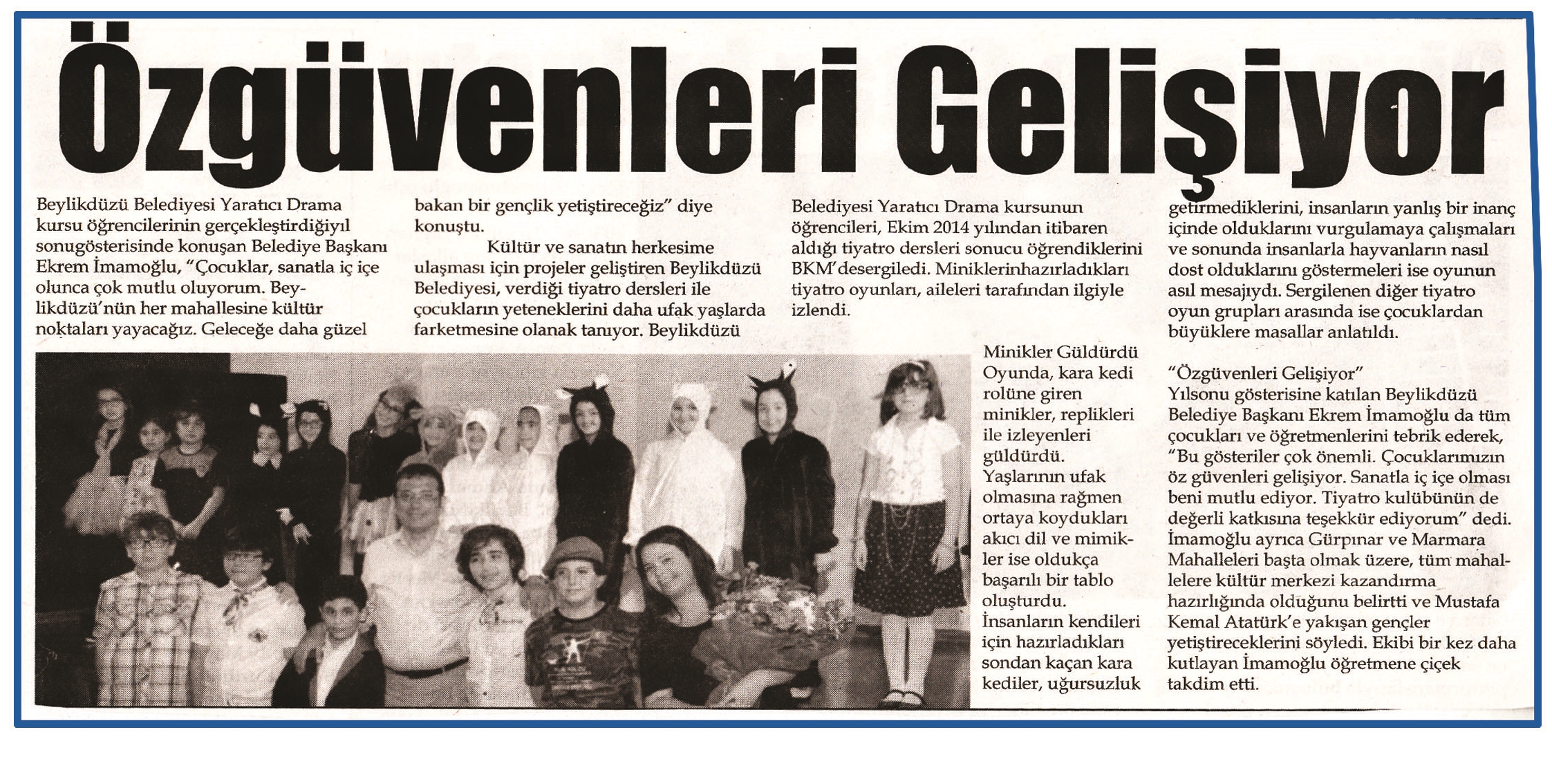 25 Mayıs 2015 tarihli ''BEYLİKDÜZÜ'' gazetesi. Beylikdüzü Belediyesi Yaratıcı Drama kursu öğrencilerin gerçekleştirdiği yıl sonu gösterisinde konuşan Belediye Başkanı Ekrem İmamoğlu, ''Çocuklar,sanatla iç içe olunca çok mutlu oluyorum.Beylikdüzü'nün her mahallesine kültür noktaları yayacağız.Geleceğe daha güzel bakan bir gençlik yetiştireceğiz'' diye konuştu.