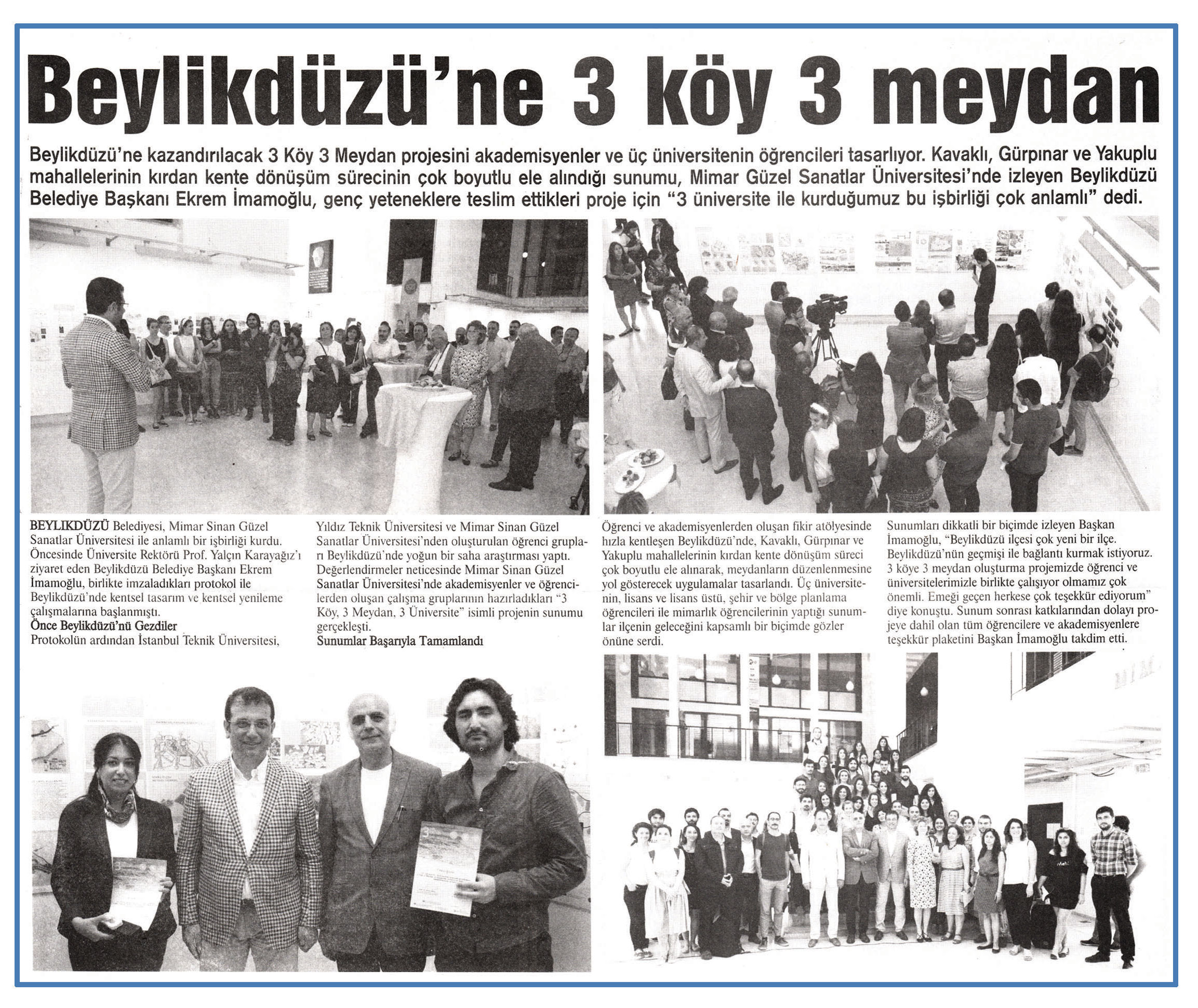 1 Temmuz 2015 tarihli "MARMARA" gazetesi. Beylikdüzü'ne kazandırılacak 3 köy 3 Meydan projesini akademisyenler ve üç üniversitenin öğrencileri tasarlıyor. Kavaklı, Gürpınar ve Yaluplu mahallelerinin kırdan kente dönüşüm sürecinin çok boyutlu ele alındığı sunumu, Mimar Güzel Sanatlar Üniversitesi'nde izleyen Beylikdüzü Belediye Başkanı Ekrem İmamoğlu, genç yeteneklere teslim ettikleri proje için " 3 üniversite ile kurduğumuzu bu işbirliği çok anlamlı" dedi.