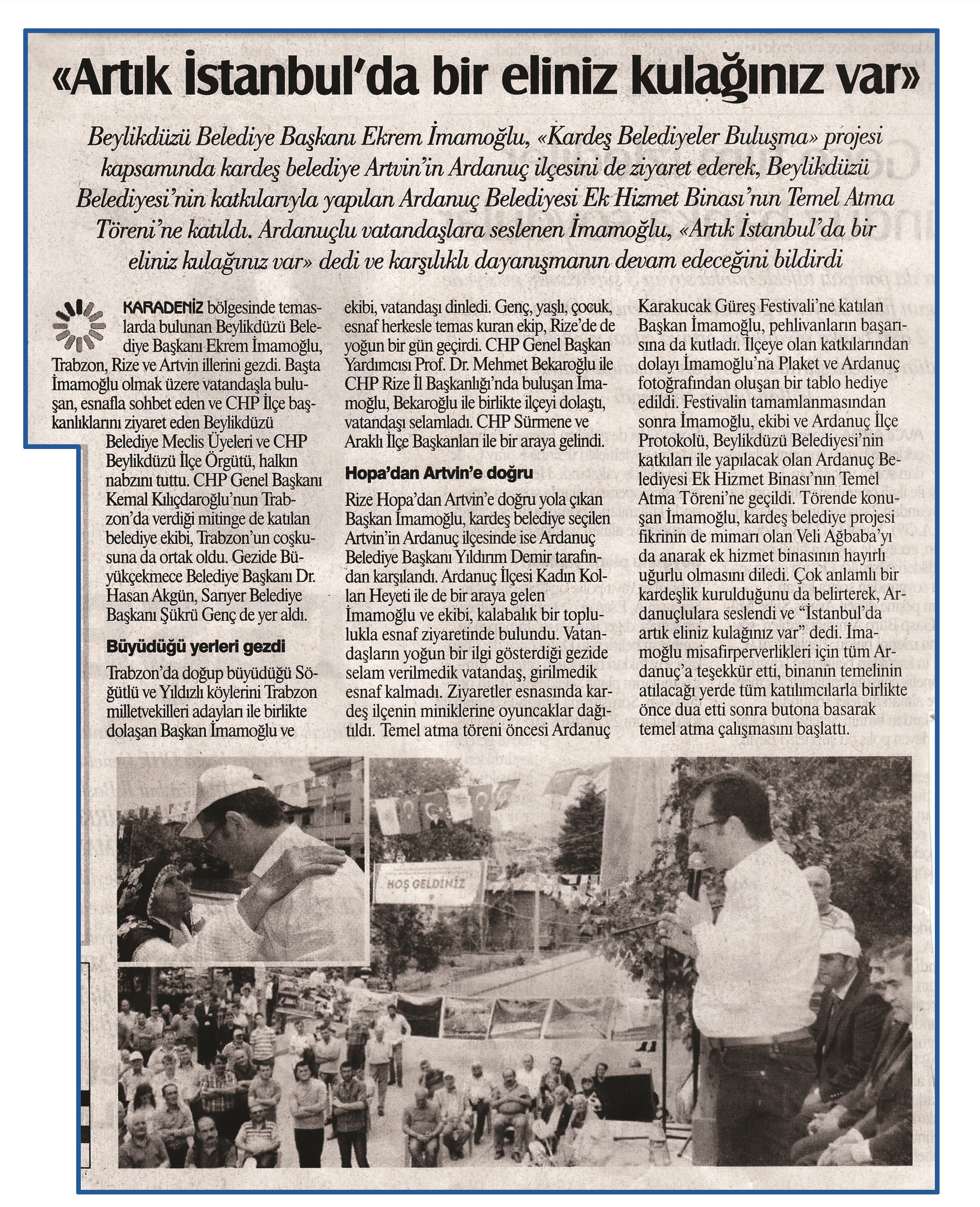 27 Mayıs 2015 tarihli ''GAZETE İSTANBUL'' gazetesi. Beylikdüzü Belediye Başkanı Ekrem İmamoğlu, ''Kardeş Belediyeler Buluşması'' projesi kapsamında kardeş belediye Artvin'in Ardanuç ilçesini de ziyaret ederek,Beylikdüzü Belediyesi'nin katkılarıyla yapılan Ardanuç Belediyesi Ek Hizmet Binası'nın Temel Atma Töreni'ne katıldı.