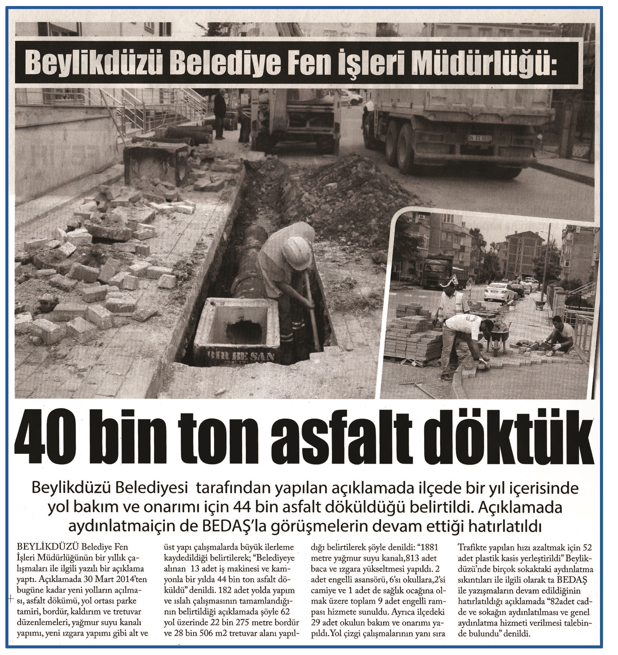29 Mayıs 2015 tarihli ''BÜYÜK TAKİP'' gazetesi. Beylikdüzü Belediyesi tarafından yapılan açıklamada ilçede bir yıl içerisinde yol bakım ve onarımı için 44 bin asfalt döküldüğü belirtildi.Açıklamada aydınlatma için de BEDAŞ'la görüşmelerin devam ettiği hatırlatıldı.