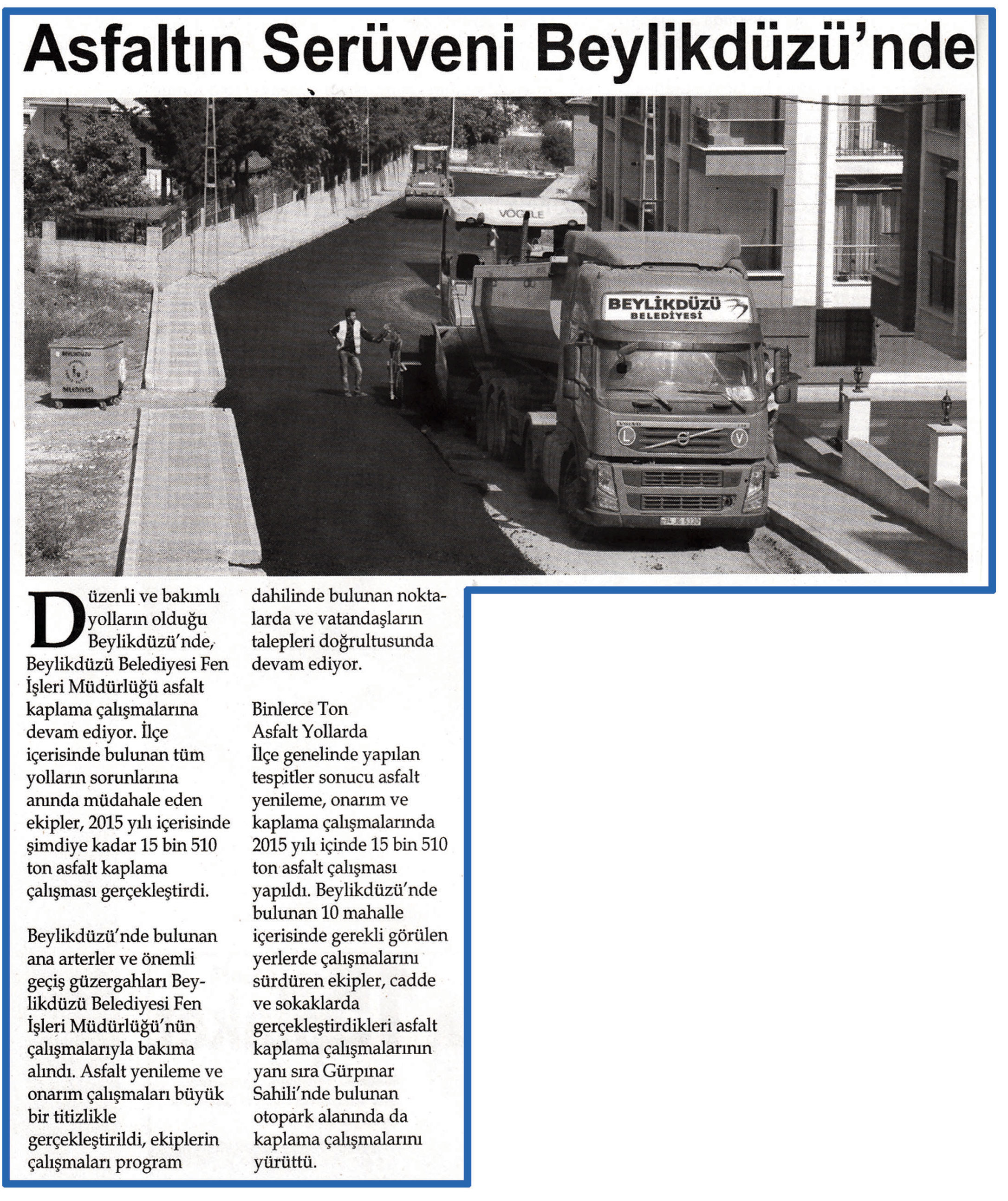 3 Ağustos 2015 tarihli "BEYLİKDÜZÜ" gazetesi. Düzenli ve bakımlı yolların olduğu Beylikdüzü'nde, Beylikdüzü Belediyesi Fen İşleri Müdürlüğü asfalt kaplama çalışmalarına devam ediyor. İlçe içerisinde bulunan tüm yolların sorunlarına anında müdahale eden ekipler,2015 yılı içerisinde şimdiye kadar 15 bin 510 ton asfalt kaplama çalışması gerçekleştirdi.