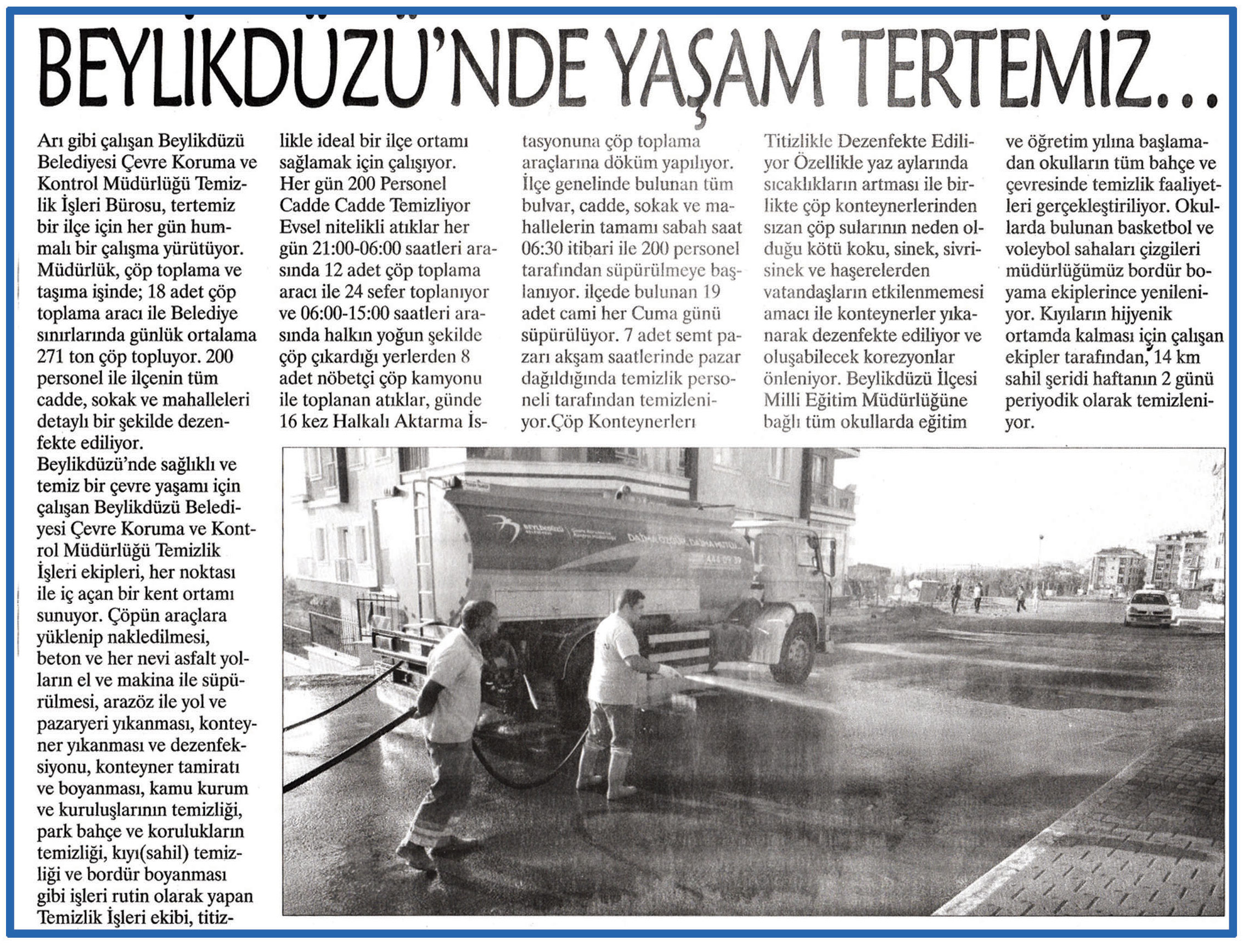 3 Ağustos 2015 tarihli ''BÜYÜKÇEKMECE'' gazetesi. Arı gibi çalışan Beylikdüzü Belediyesi Çevre Koruma ve Kontrol Müdürlüğü Temzilik İşleri Bürosu,tertemiz bir ilçe için her gün hummalı bir çalışma yürütüyor.