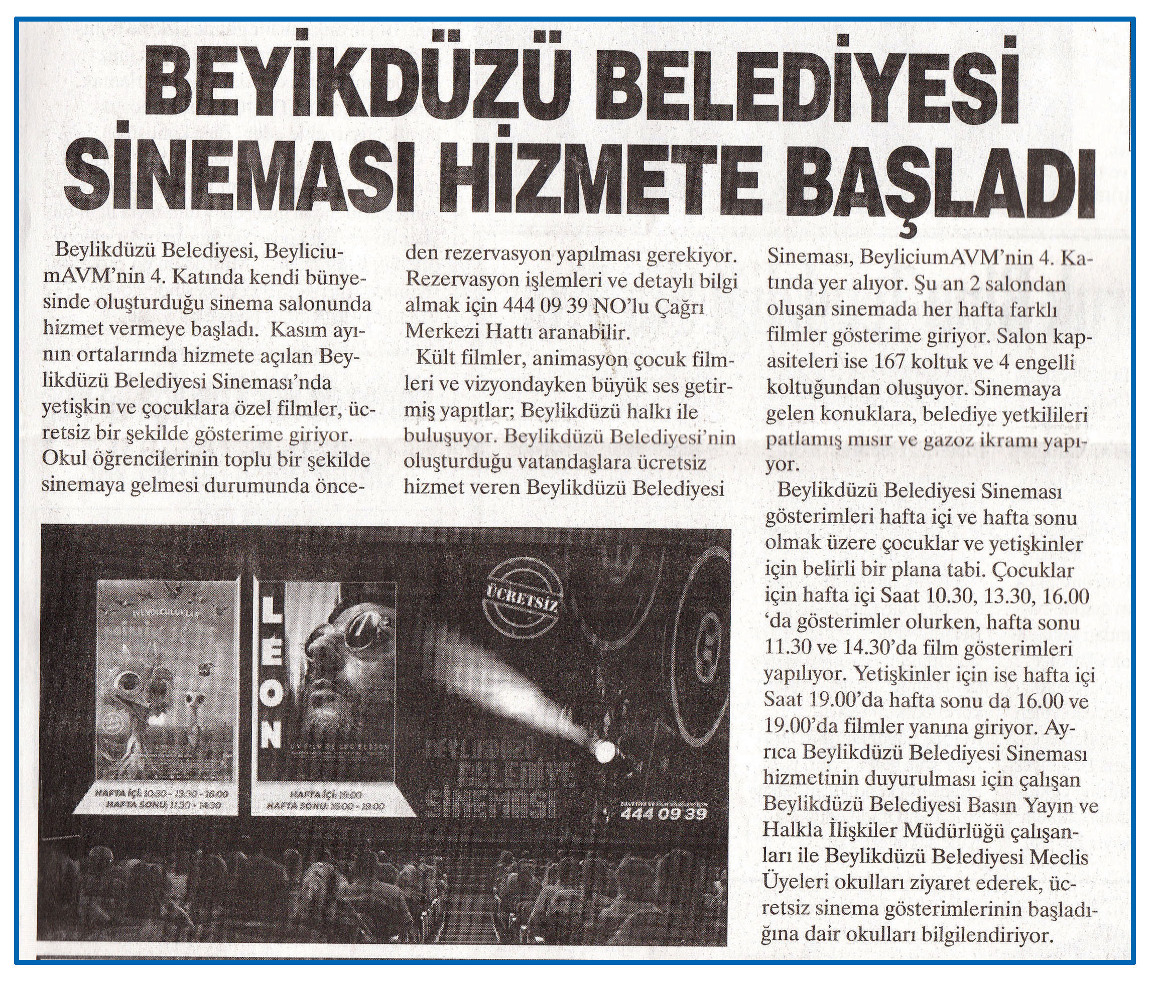 2 Aralık 2015 tarihli "YURT HABER" gazetesi. Beylikdüzü Belediyesi, Beylicium AVM'nin 4. Katında kendi bünyesinde oluşturduğu sinema salonunda hizmet vermeye başladı.