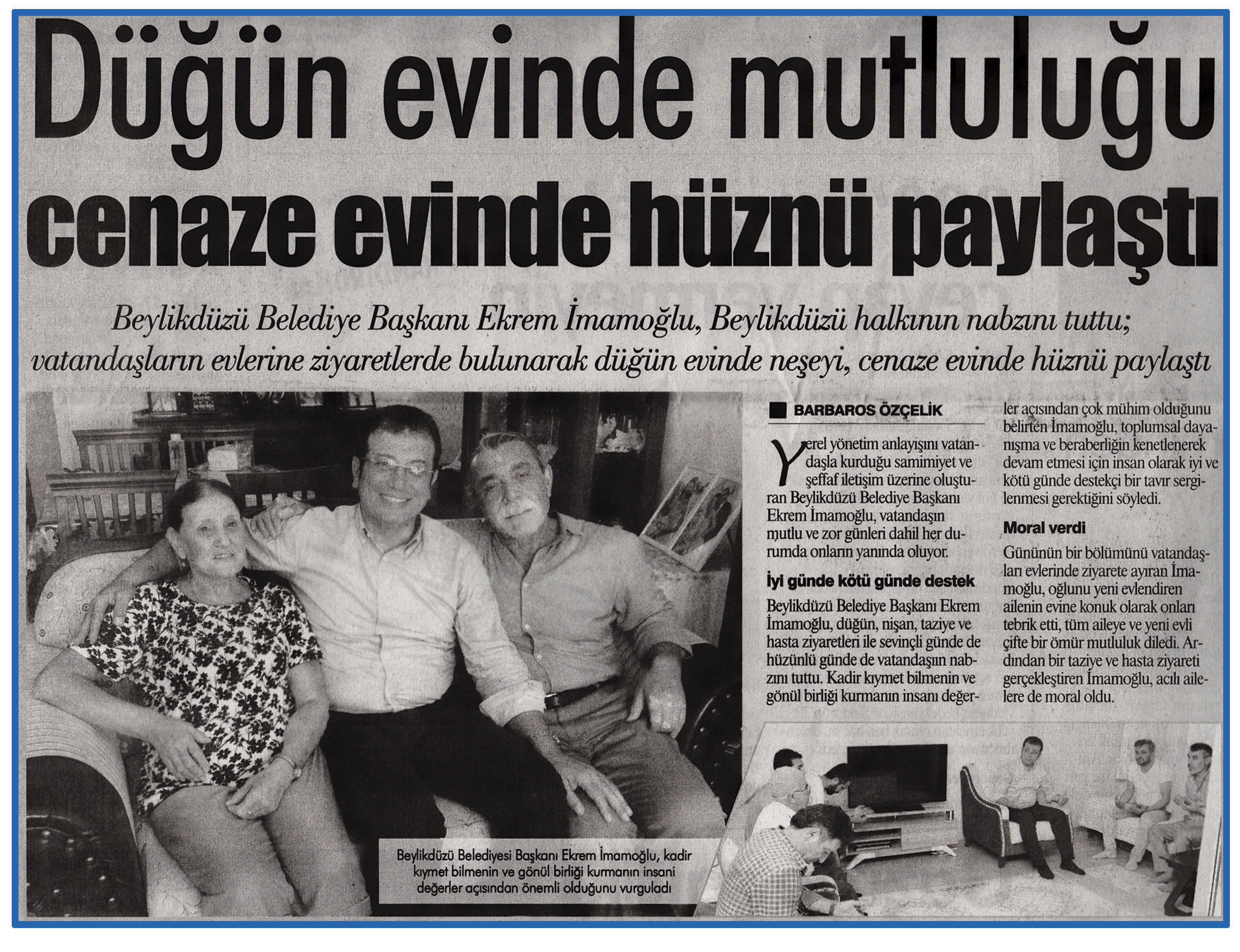 5 Ağustos 2015 tarihli "GAZETE İSTANBUL" gazetesi. Beylikdüzü Belediye Başkanı Ekrem İmamoğlu, Beylikdüzü halkının nabzını tuttu; vatandaşların evlerine ziyaretlerde bulunarak evinde neşeyi, cenaze evinde hüznü paylaştı.