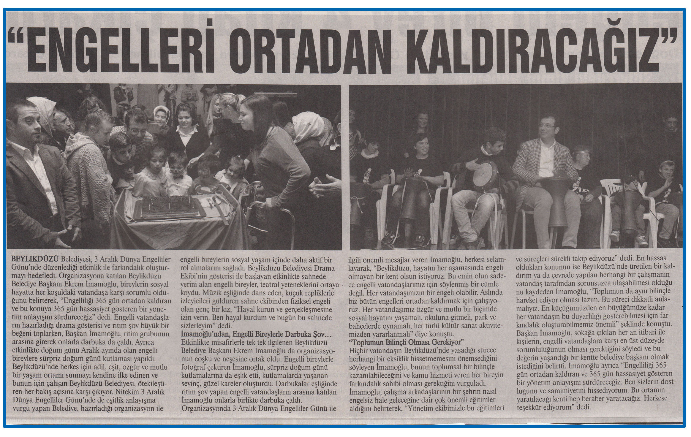 4 Aralık 2015 tarihli "MARMARA" gazetesi. Beylikdüzü Belediyesi, 3 aralık Dünya Engelliler Günü'nde düzenlediği etkinlik ile farkındalık oluşturmayı hedefledi.