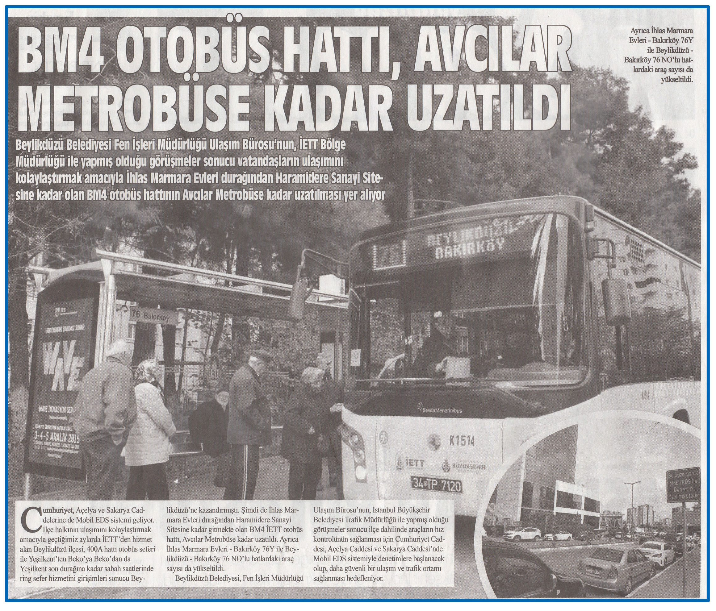 4 Aralık 2015 tarihli "YANKI" gazetesi. Beylikdüzü Belediyesi Fen İşleri Müdürlüğü Ulaşım Bürosu'nun, İETT Bölge Müdürlüğü ile yapmış olduğu görüşmeler sonucu vatandaşların ulaşımını kolaylaştırmak amacıyla İhlas Marmara Evleri durağından Haramidere Sanayi Sitesine kadar olan BM4 otobüs hattının Avcılar Metrobüse kadar uzatılması yer alıyor.