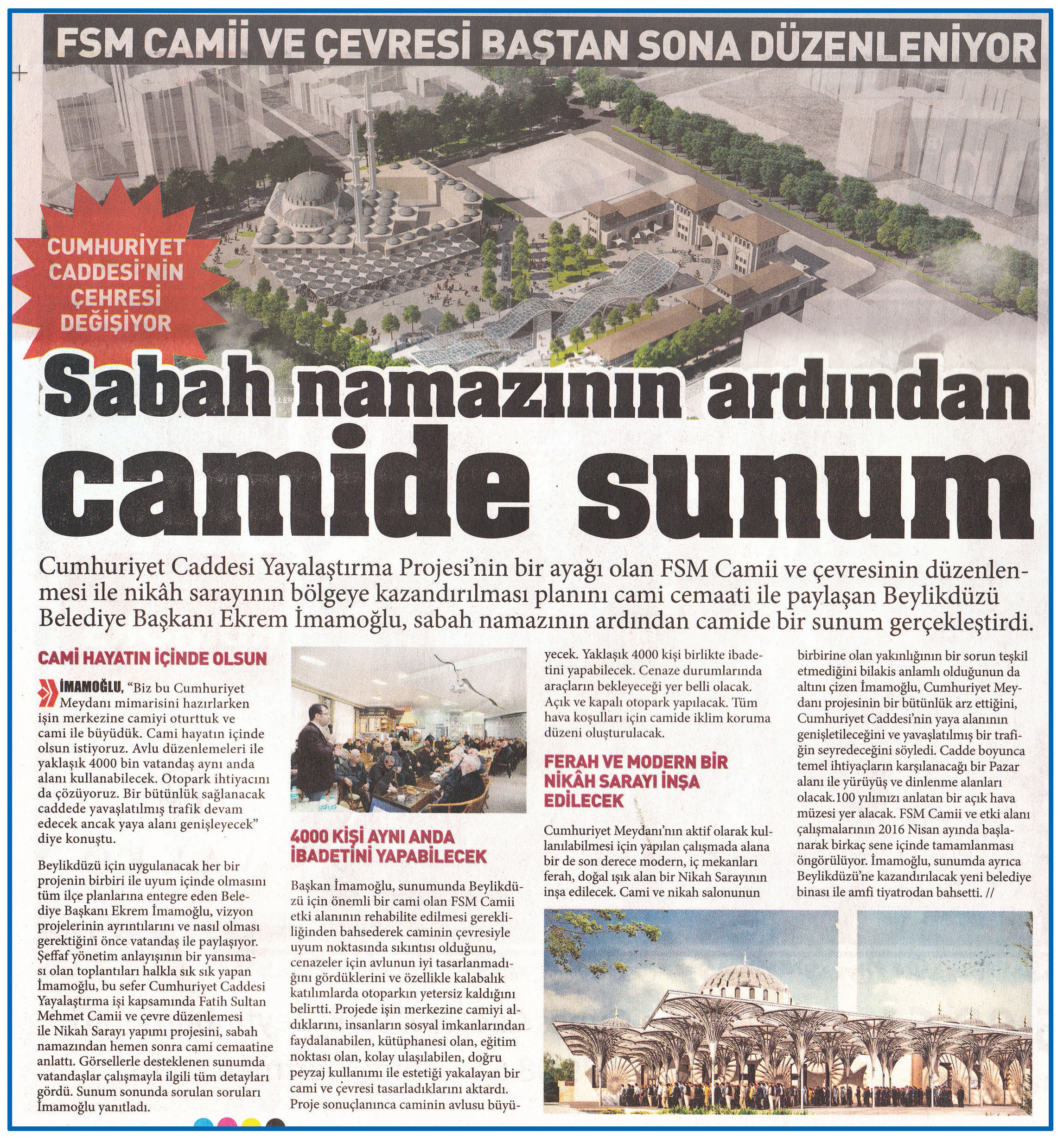 08 Aralık 2015 tarihli "212 HABER" gazetesi. Cumhuriyet Caddesi Yayalaştırma Projesi'nin bir ayağı olan FSM Camiive çevresinin düzenlenmesi ile nikah sarayının bölgeye kazandırılması planını cami cemaati ile paylaşan Beylikdüzü Belediye Başkanı Ekrem İmamoğlu, sabah namazının ardından camide bir sunum gerçekleştirdi.