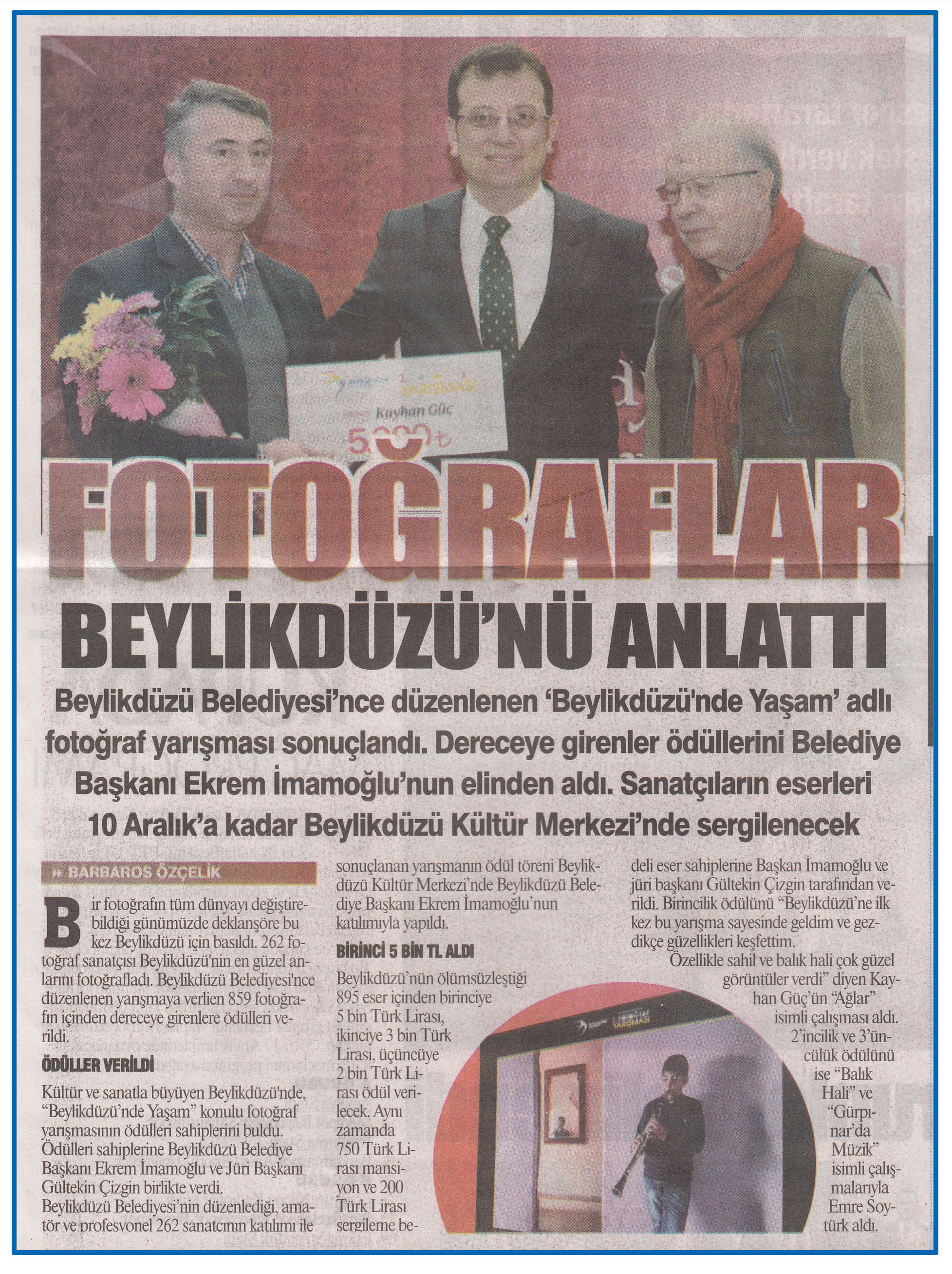 9 Aralık 2015 tarihli "GAZETE İSTANBUL" gazetesi. Beylikdüzü Belediyesi'nce düzenlenen 'Beylikdüzü'nde Yaşam' adlı fotoğraf yarışması sonuçlandı. Dereceye girenler ödüllerini Belediye Başkanı Ekrem İmamoğlu'nun elinden aldı. Sanatçıların eserleri 10 Aralık'a kadar Beylikdüzü Kültür Merkezi'nde sergilenecek.