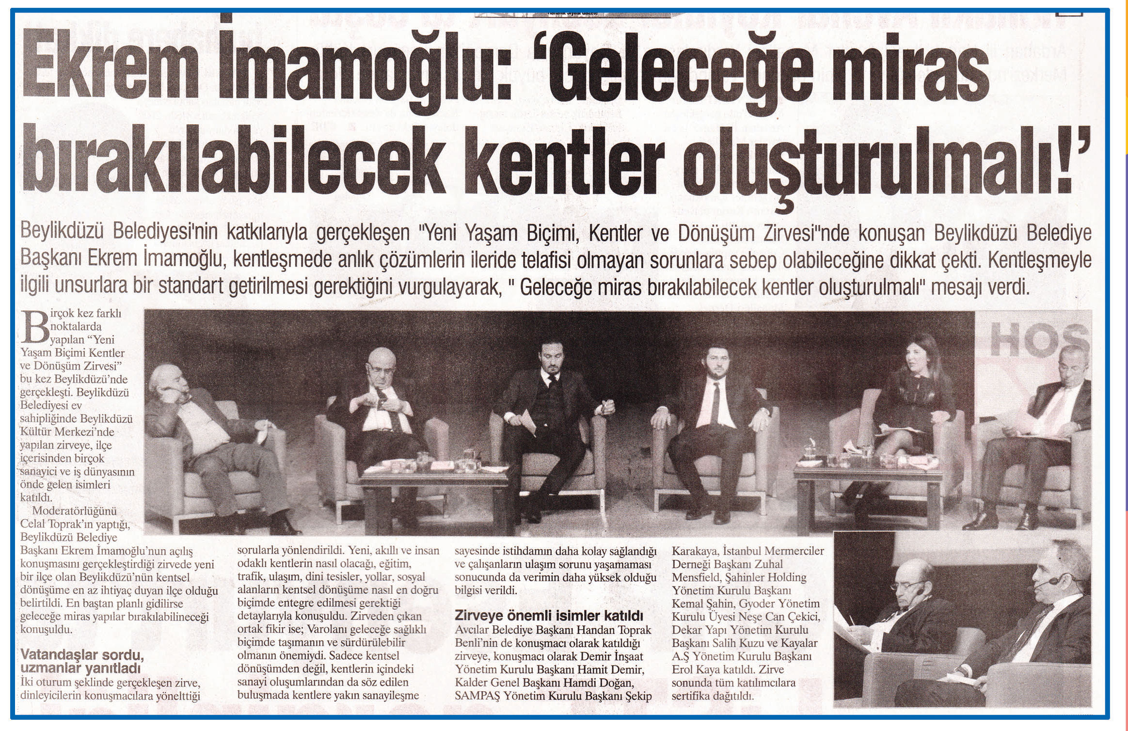 10 Aralık 2015 tarihli "KENT HABER" gazetesi. Beylikdüzü Belediyesi'nin katkılarıyla gerçekleşen "Yeni Yaşam Biçimi, Kentler ve Dönüşüm Zirvesi"nde konuşan Beyllikdüzü Belediye Başkanı Ekrem İmamoğlu, kentlemede anlık çözümlerin ileride telafisi olmayan sorunlara sebep olabileceğine dikkat çekti. Kentleşmeyle ilgili unsurlara bir standart getirilmesi gerektiğini vurgulayarak, "Geleceğe miras bırakılabilecek kentler oluşturmalı" mesajı verdi.