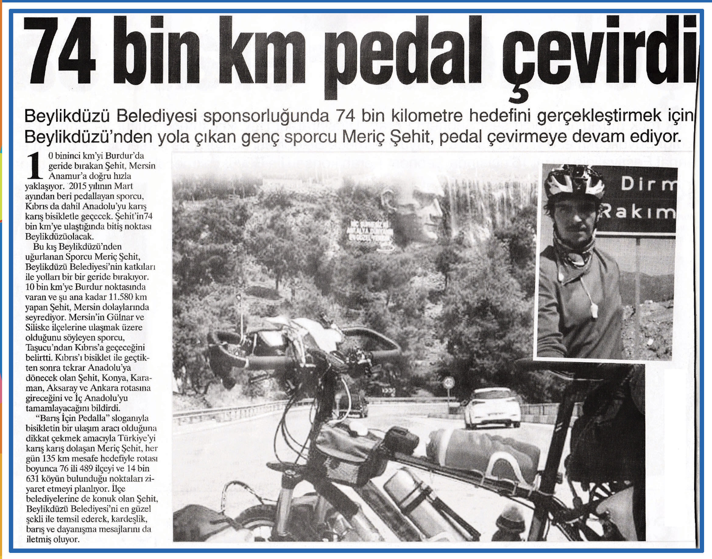 7 Ağustos 2015 tarihli "HABERCİ" gazetesi. Beylikdüzü Belediyesi sponsorluğunda 74 bin kilometre hedefini gerçekleştirmek için Beylikdüzü'nde yola çıkan genç sporcu Meriç Şehit pedal çevirmeye devam ediyor.