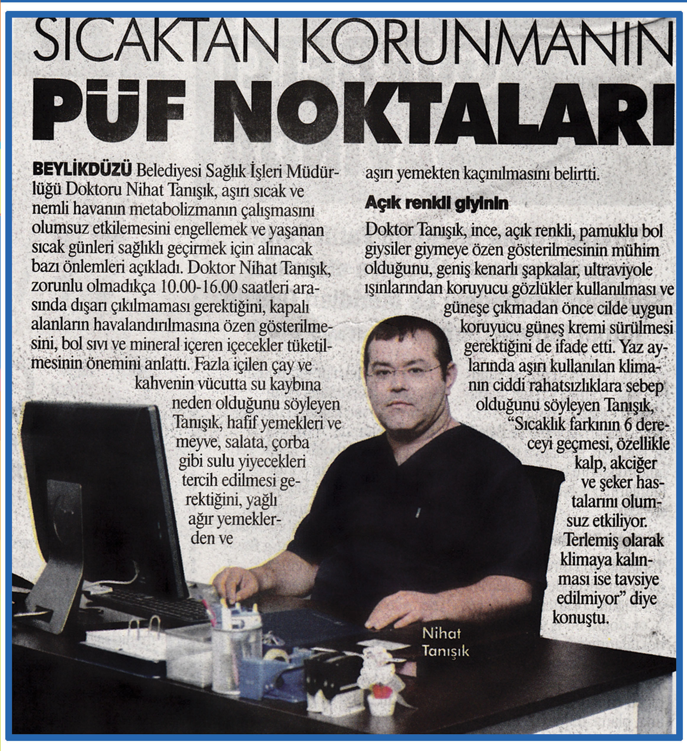 10 Ağustos 2015 tarihli " GAZETE İSTANBUL" gazetesi. Beylikdüzü Belediyesi Sağlık İşleri Müdürlüğü Doktoru Nihat Tanışık, aşırı sıcak ve nemli havanın metabolizmanın çalışmasını olumsuz etkilemesini engellemek ve yaşanan sıcak günleri sağlıklı geçirmek için alınacak bazı önlemleri açıkladı.