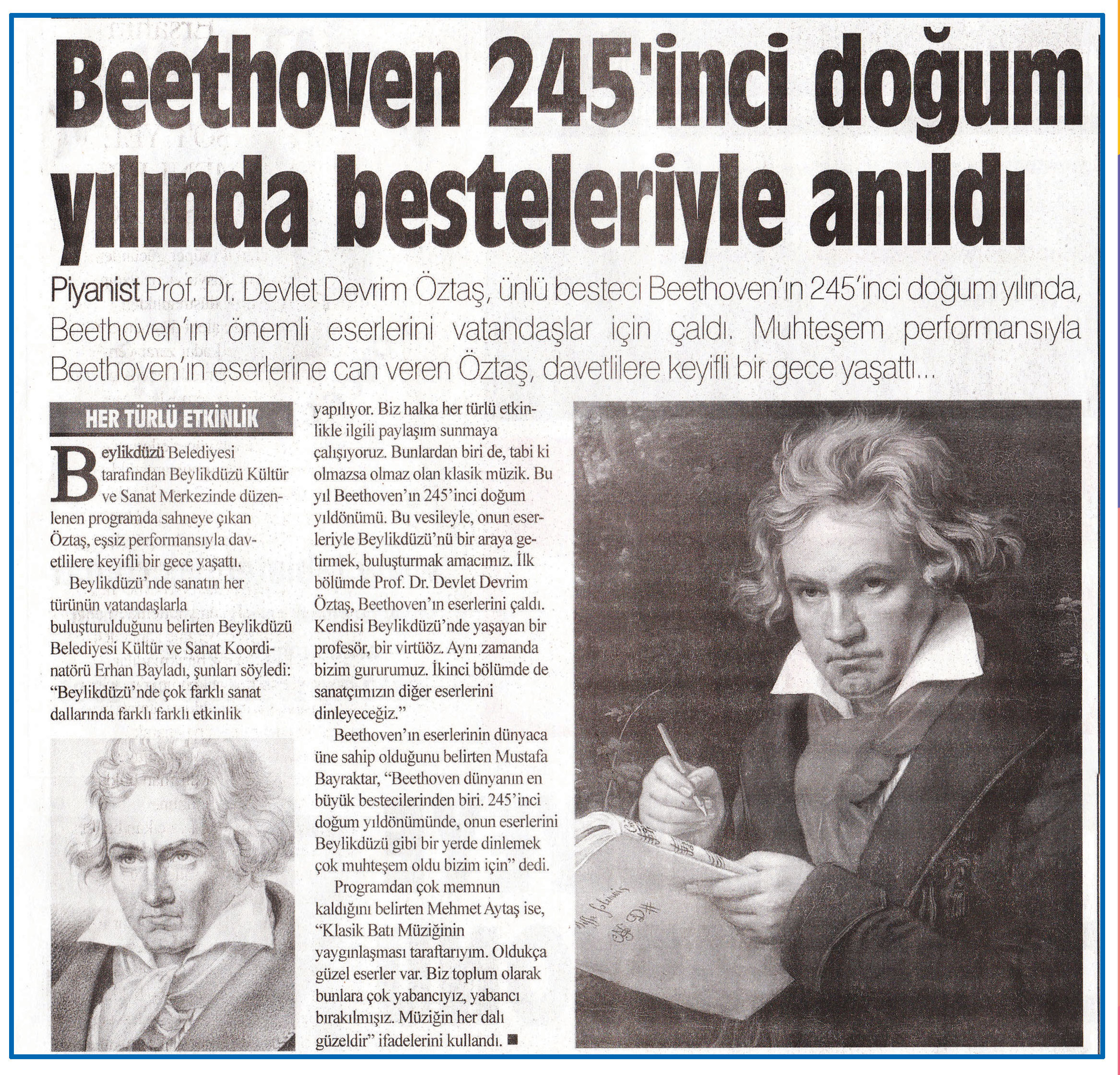 15 Aralık 2015 tarihli "YANKI" gazetesi. Piyanist Prof. Dr. Devlet Devrim Öztaş, ünlü besteci Beethoven'ın 245'inci doğum yılında Beethoven'ın önemli eserlerin vatandaşlar için çaldı.
