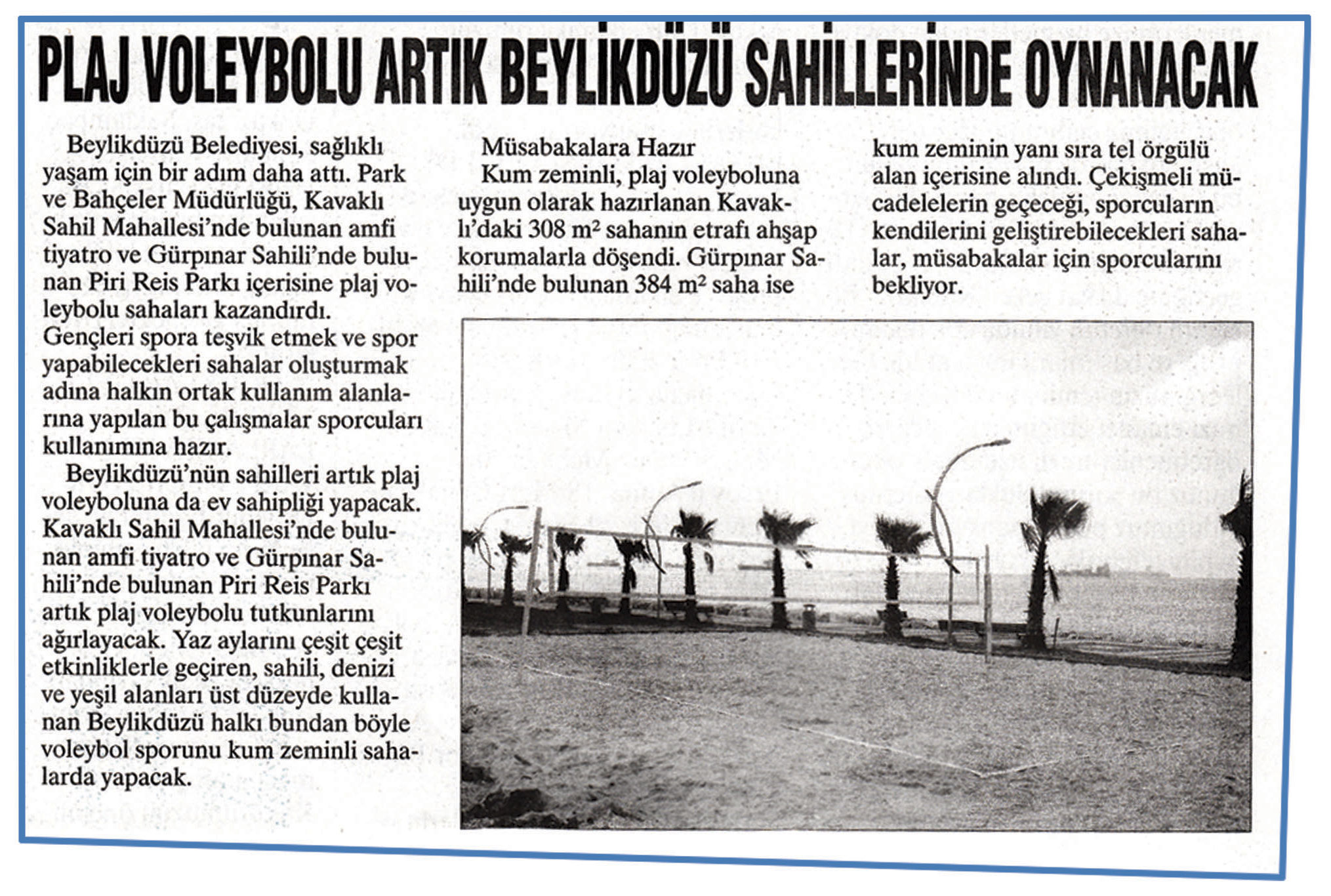 3 Temmuz 2015 tarihli ''BÜYÜKÇEKMECE'' gazetesi. Beylikdüzü Belediyesi,sağlıklı yaşam için bir adım daha attı. Park ve Bahçeler Müdürlüğü, Kavaklı Sahil Mahallesi'nde bulunan amfi tiyatro ve Gürpınar Sahili'nde bulunan Piri Reis Parkı içerisine plaj voleybolu sahaları kazandırdı.