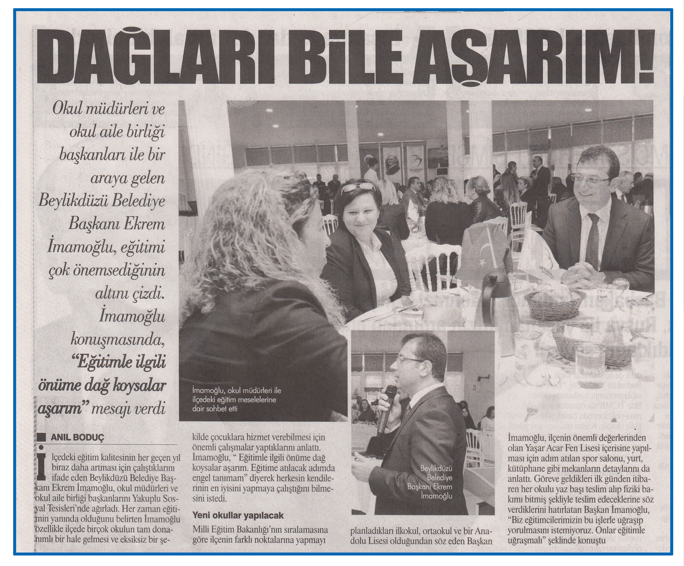17 Aralık 2015 tarihli "GAZETE İSTANBUL" gazetesi. Okul müdürleri ve okul aile birliği başkanları ile bir araya gelen Beylikdüzü Belediye Başkanı Ekrem İmamoğlu, eğitimi çok önemsediğinin altını çizdi.