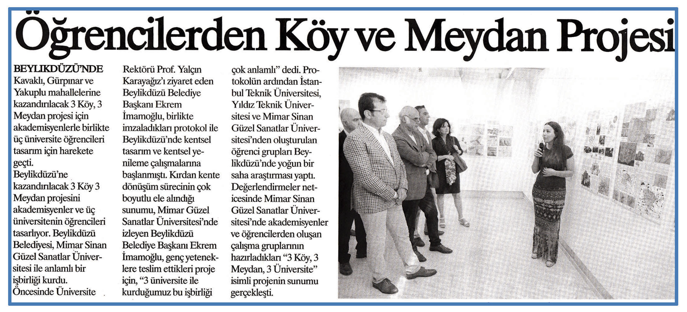 3 Temmuz 2015 tarihli ''KENT GÜNDEM'' gazetesi. Beylikdüzü'nde Kavaklı,Gürpınar ve Yakuplu mahallelerine kazandırılacak 3 Köy,3 Meydan projesi için akademisyenlerle birlikte üç üniversite öğrencileri tasarım için harekete geçti.