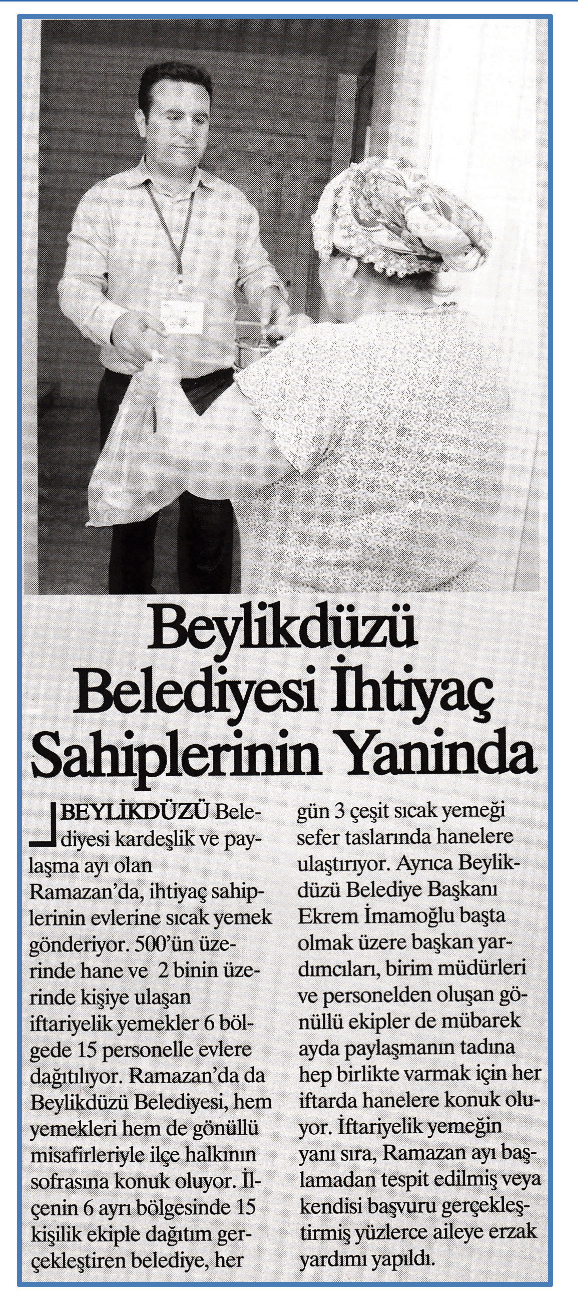 3 Temmuz 2015 tarihli ''KENT GÜNDEM'' gazetesi. Beylikdüzü Belediyesi kardeşlik ve paylaşma ayı olan Ramazan'da,ihtiyaç sahiplerinin evlerine sicak yemek gönderiyor.500'ün üzerinde hane ve 2 binin üzerinde kişiye ulaşan iftariyelik yemekler 6 bölgede 15 personelle evlere dağıtılıyor.