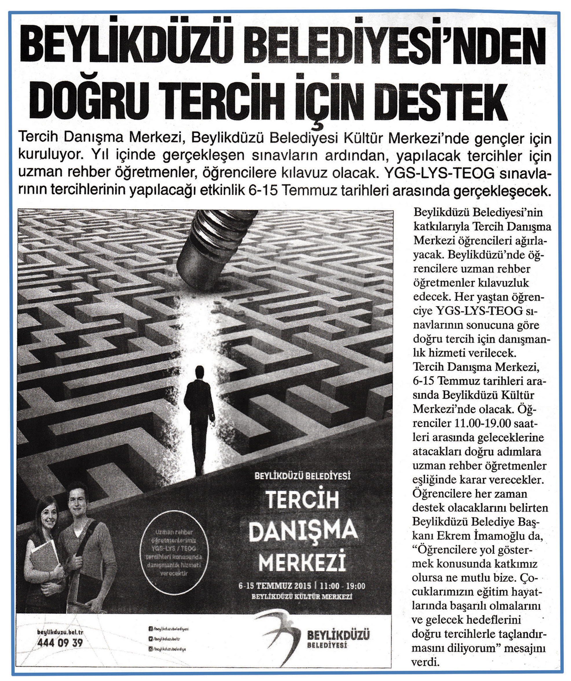 6 Temmuz 2015 tarihli ''BÜYÜKÇEKMECE'' gazetesi. Tercih Danışma Merkezi,Beylikdüzü Belediyesi Kültür Merkezi'nde gençler için kuruluyor.Yıl içinde gerçekleşen sınavların ardından,yapılacak tercihler için uzman rehber öğretmenler,öğrencilere kılavuz olacak. YGS-LYS-TEOG sınavlarının tercihlerinin yapılacağı etkinlik 6-15 Temmuz tarihleri arasında gerçekleşecek.