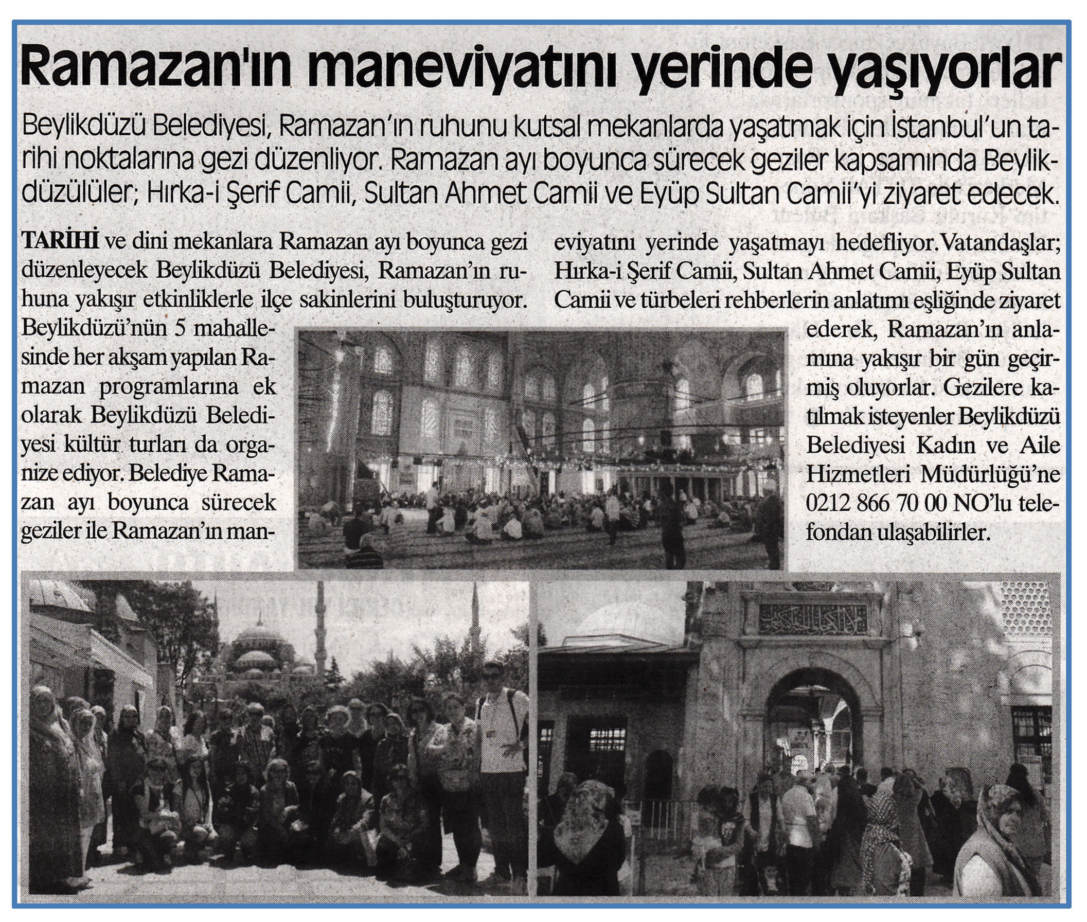 6 Temmuz 2015 tarihli ''DEĞİŞİM'' gazetesi. Beylikdüzü Belediyesi, Ramazan'ın ruhunu kutsal mekanlarda yaşatmak için İstanbul'un tarihi noktalarına gezi düzenliyor.Ramazan ayı boyunca sürecek geziler kapsamında Beylikdüzülüler;Hırka-i Şerif Camii, Sultan Ahmet Camii ve Eyüp Sultan Camii'yi ziyaret edecek.