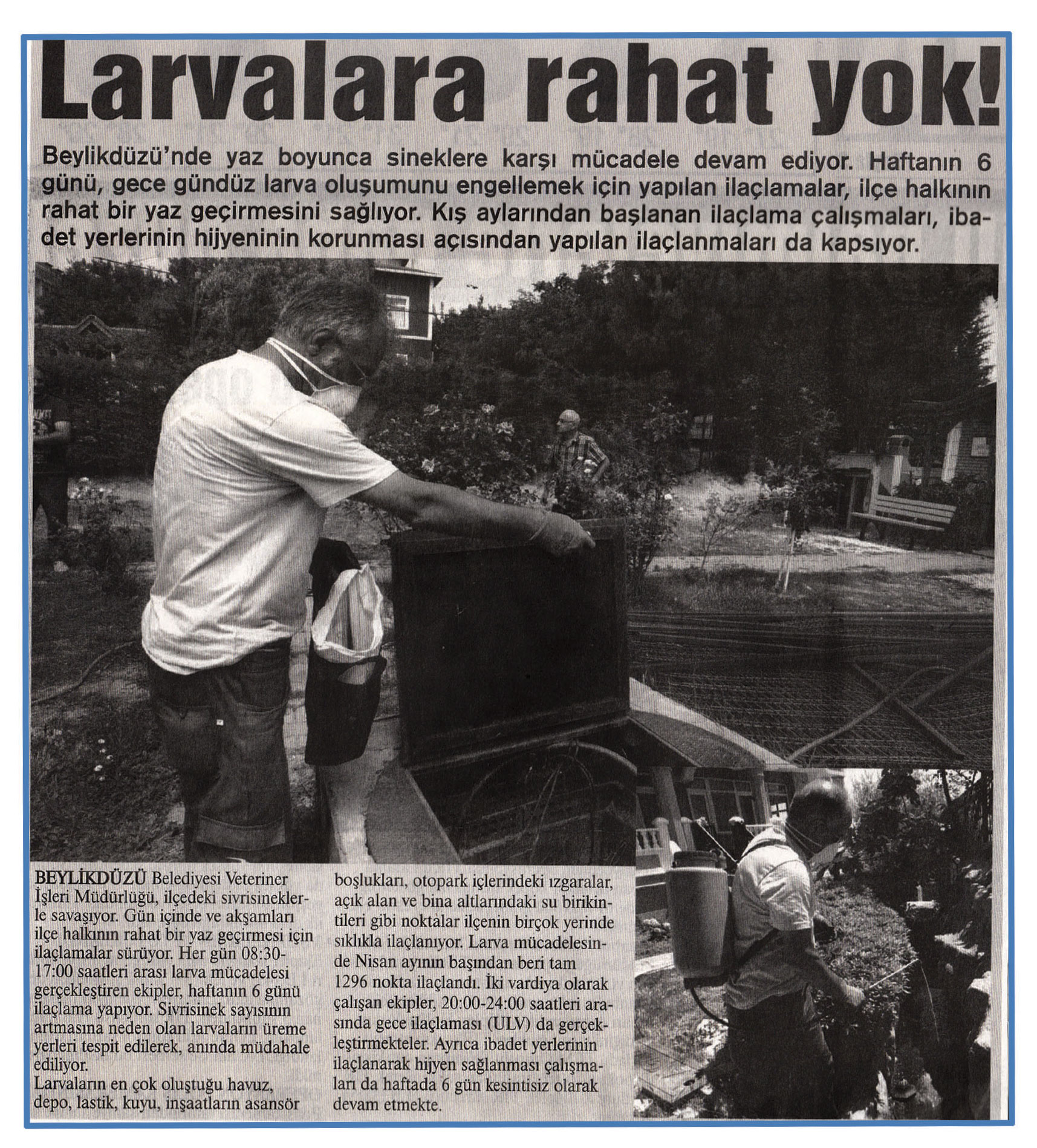 6 Temmuz 2015 tarihli ''MARMARA'' gazetesi. Beylikdüzü'nde yaz boyunca sineklere karşı mücadele devam ediyor.Haftanın 6 günü,gece gündüz larva oluşumunu engellemek için yapılan ilaçlamalar,ilçe halkının rahat bir yaz geçirmesini sağlıyor.