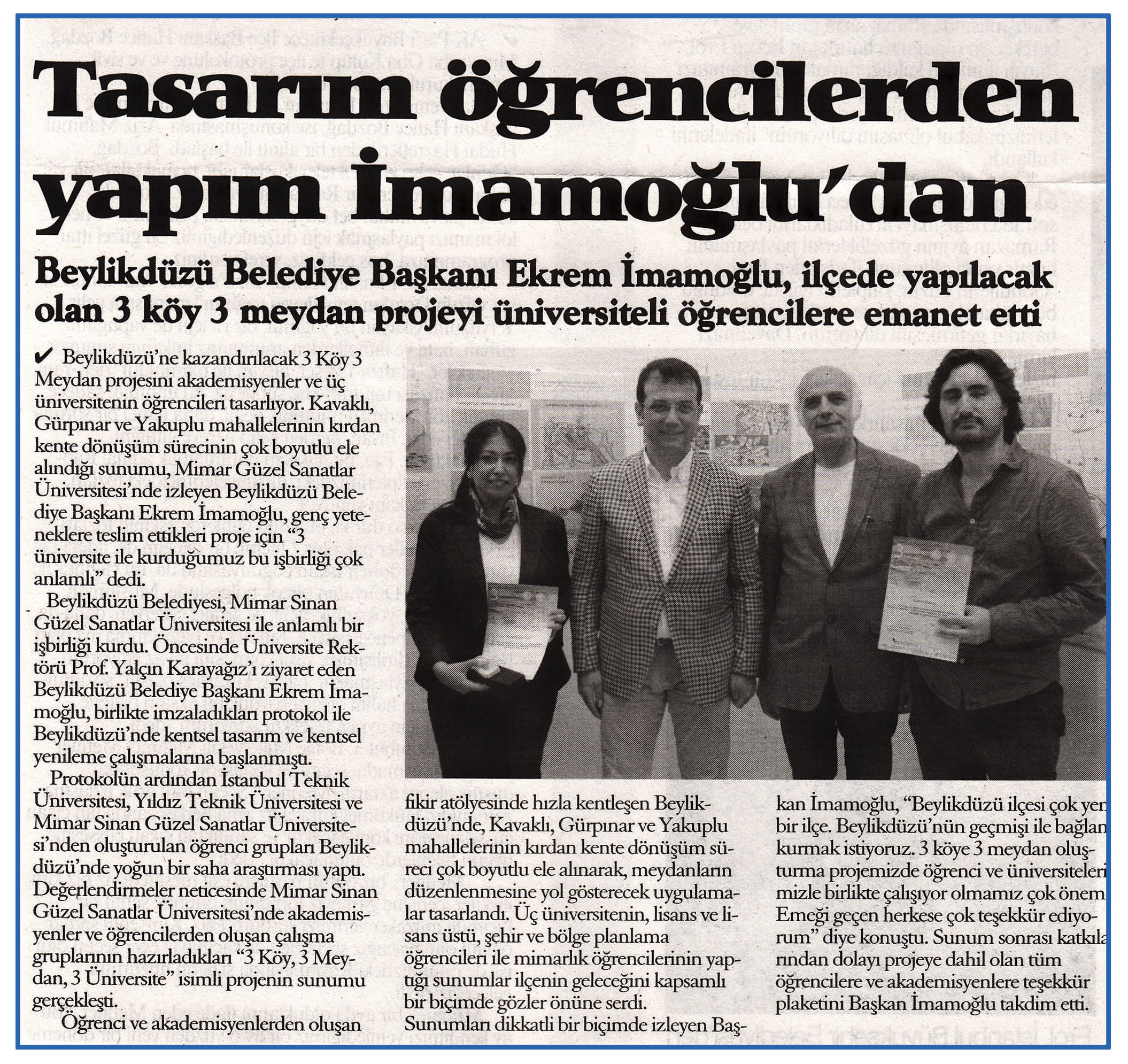 7 Temmuz 2015 tarihli ''ANAHABER'' gazetesi. Beylikdüzü Belediye Başkanı Ekrem İmamoğlu, ilçede yapılacak olan 3 köy 3 meydan projeyi üniversiteli öğrencilere emanet etti.