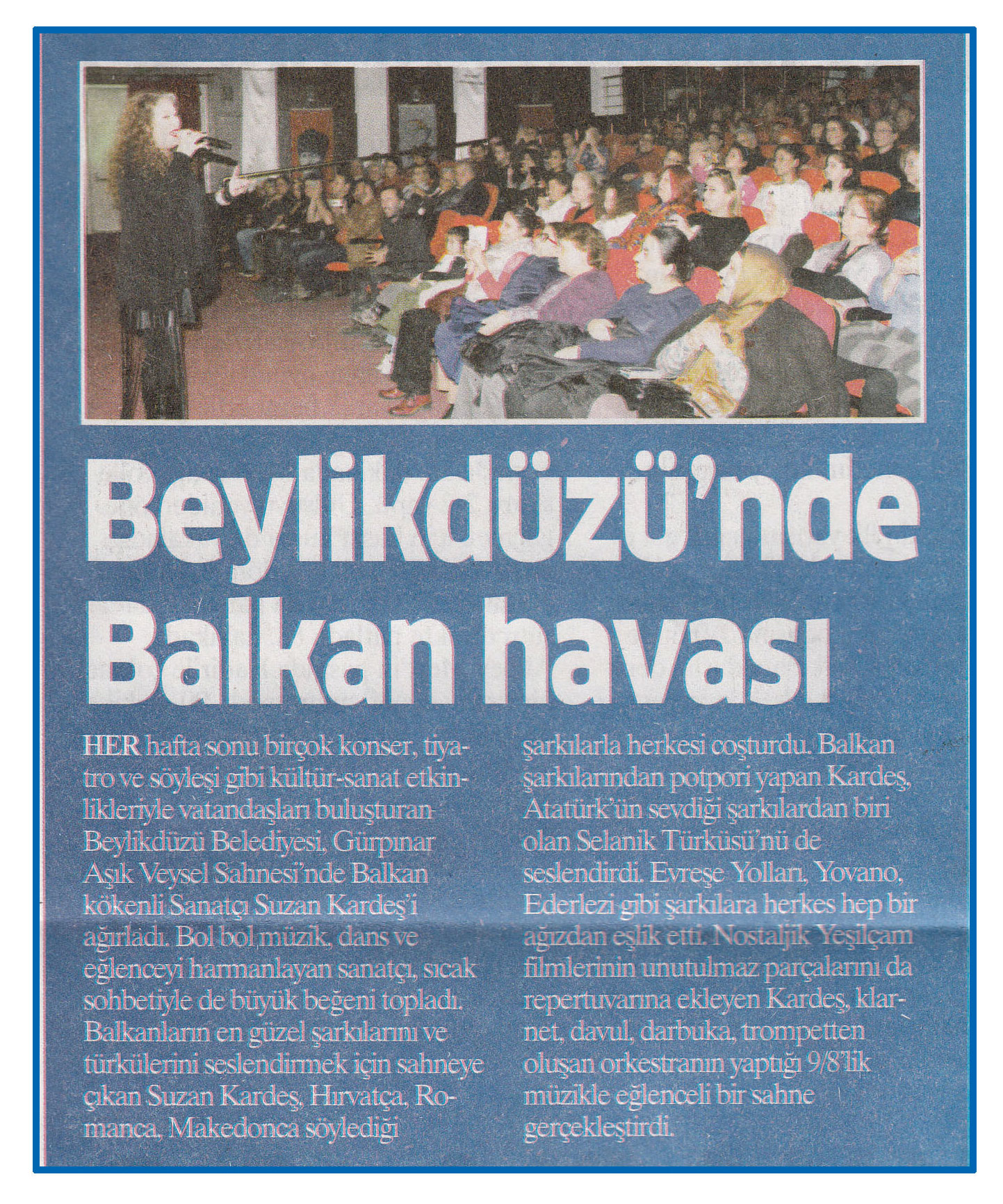 23 Aralık 2015 tarihli "HABER EKSPRESS" gazetesi. Her hafta sonu birçok konser, tiyatro ve söyleşi gibi kültür - sanat etkinlikleriyle vatandaşları buluşturan Beylikdüzü Belediyesi, Gürpınar Aşık Veysel Sahnesi'nde Balkan kökenli Sanatçı Suzan Kardeş'iağırladı.