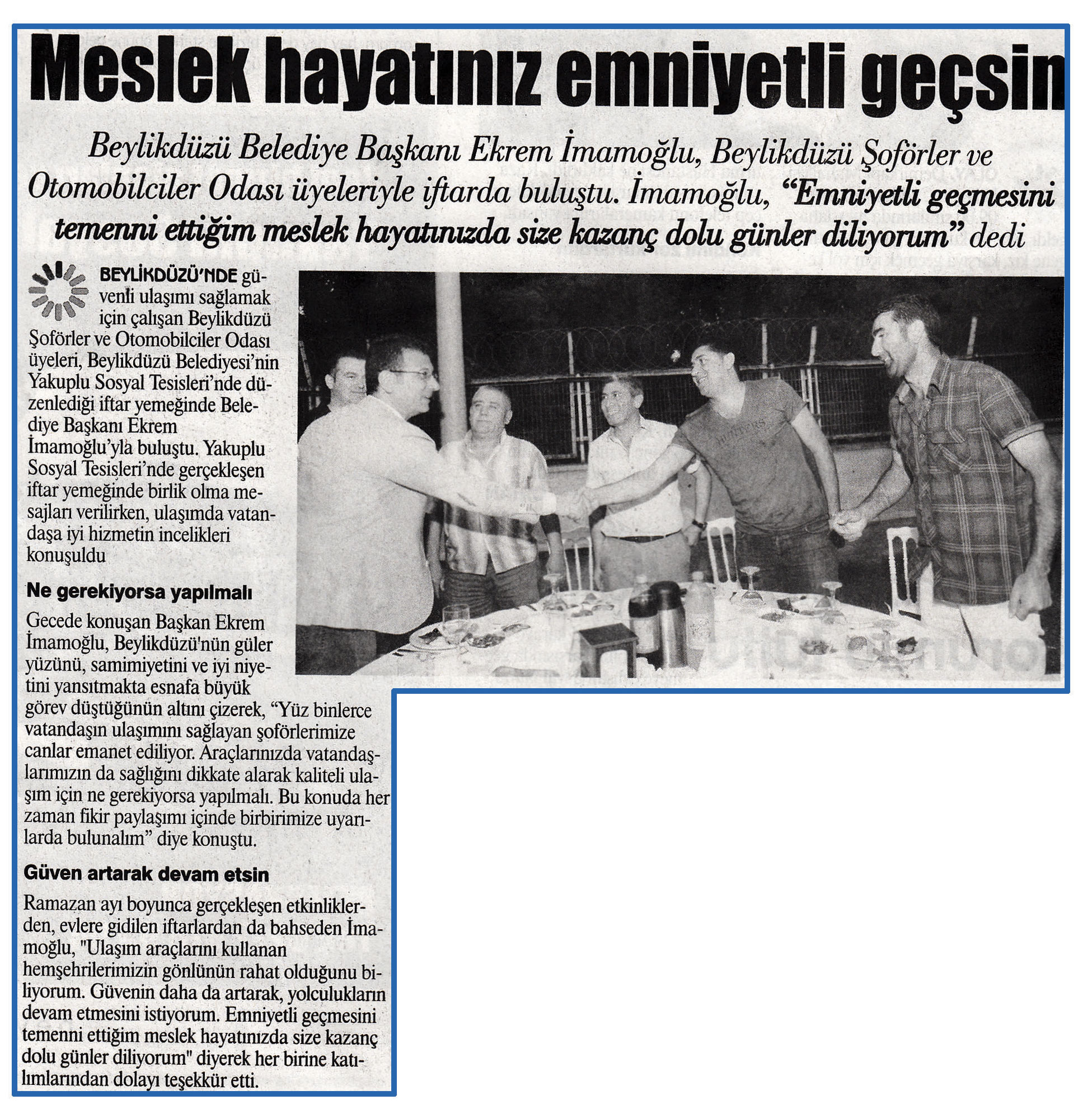 14 Temmuz 2015 tarihli ''GAZETE İSTANBUL'' gazetesi. Beylikdüzü Belediye Başkanı Ekrem İmamoğlu,Beylikdüzü Şoförler ve Otomobilciler Odası üyeleriyle iftarda buluştu.İmamoğlu, ''Emniyetli geçmesini temenni ettiğim meslek hayatınızda size kazanç dolu günler diliyorum'' dedi.