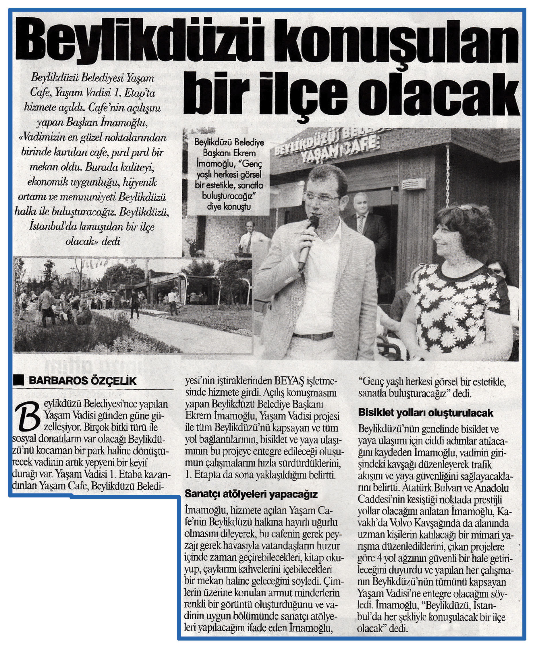 20 Temmuz 2015 tarihli ''GAZETE İSTANBUL'' gazetesi. Beylikdüzü Belediyesi'nce yapılan Yaşam Vadisi günden güne güzelleşiyor.