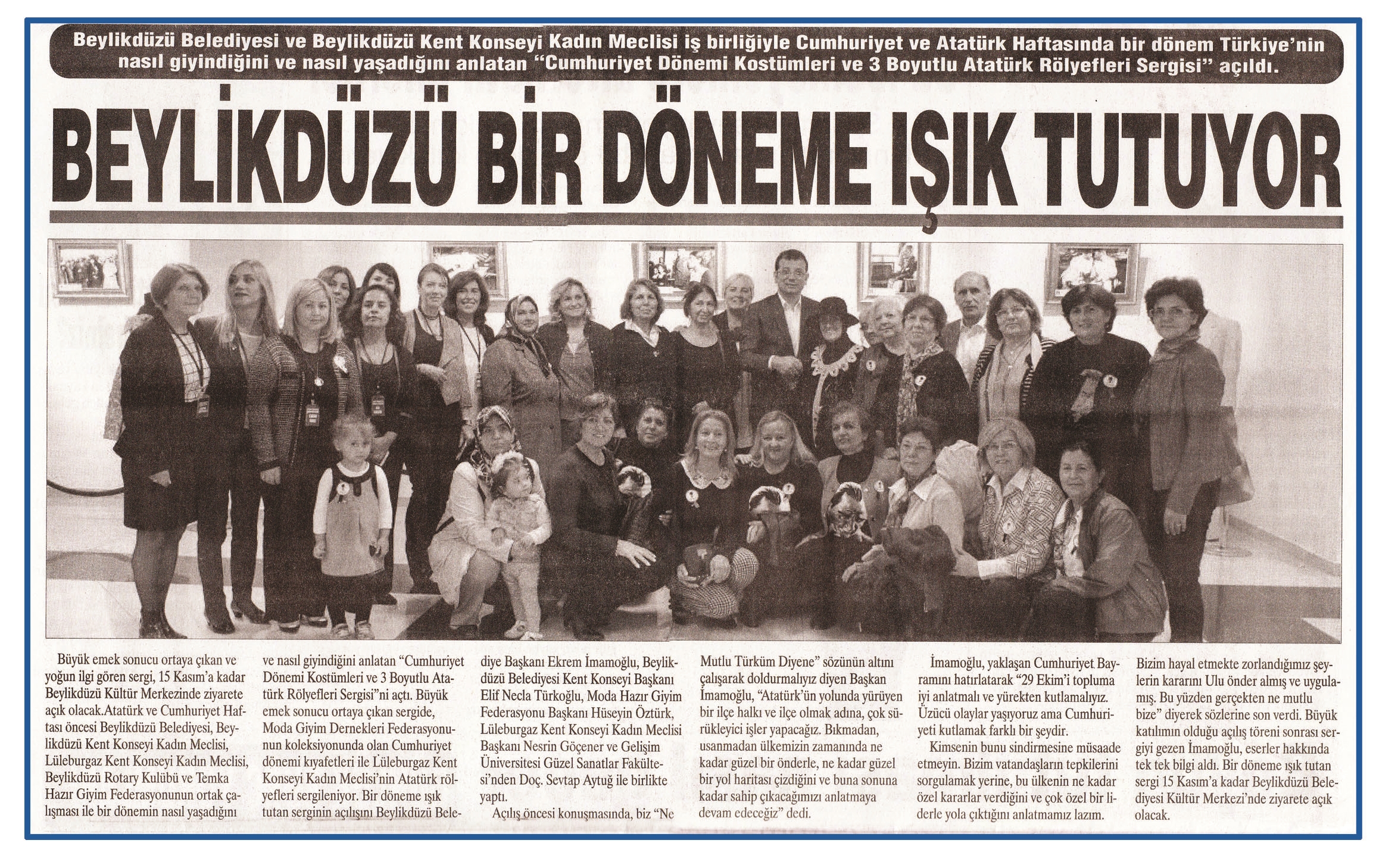 2 Kasım 2015 tarihli "BÜYÜKÇEKMECE" gazetesi. Beylikdüzü Belediyesi ve Beylikdüzü Kent Konseyi Kadın Meclisi iş birliğiyle Cuhuriyet ve Atatürk Haftasında bir dönem Türkiye'nin nasıl giyindiğini ve nasıl yaşadığını anlatan "Cumhuriyet Dönemi Kostümleri ve 3 Boyutlu Atatürk Rölyefleri Sergisi" açıldı.