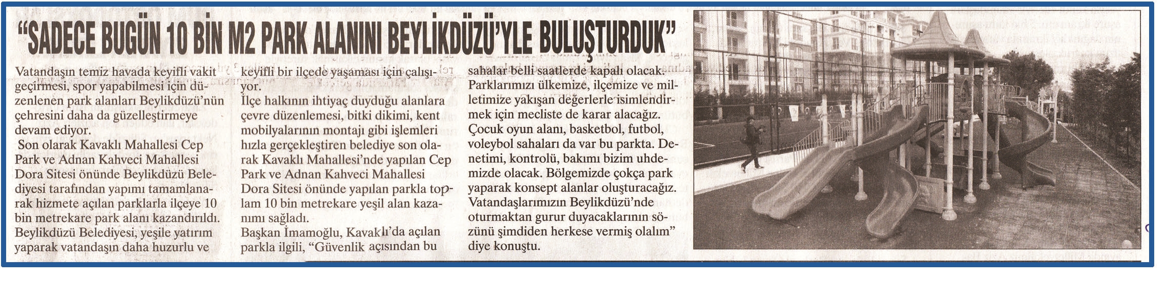 2 Kasım 2015 tarihli "BÜYÜKÇEKMECE" gazetesi. Vatandaşın temiz havada keyifli vakit geçirmesi, spor yapabilmesi için düzenlenen park alanları Beylikdüzü'nün çehresini daha da güzelleştirmeye devam ediyor.