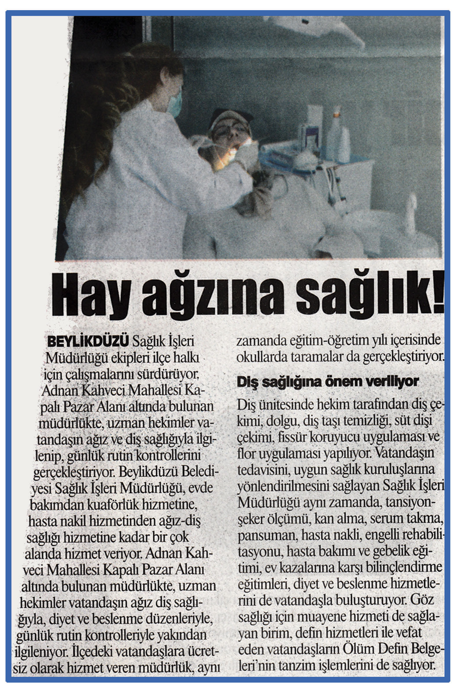23 Temmuz 2015 tarihli ''GAZETE İSTANBUL'' gazetesi. Beylikdüzü Sağlık İşleri Müdürlüğü ekipleri ilçe halkı için çalışmalarını sürdürüyor.Adnan Kahveci Mahallesi Kapalı Pazar Alanı altında bulunan müdürlükte,uzman hekimler vatandaşın ağız ve diş sağlığıyla ilgilenip,rutin kontrollerini gerçekleştiriyor.