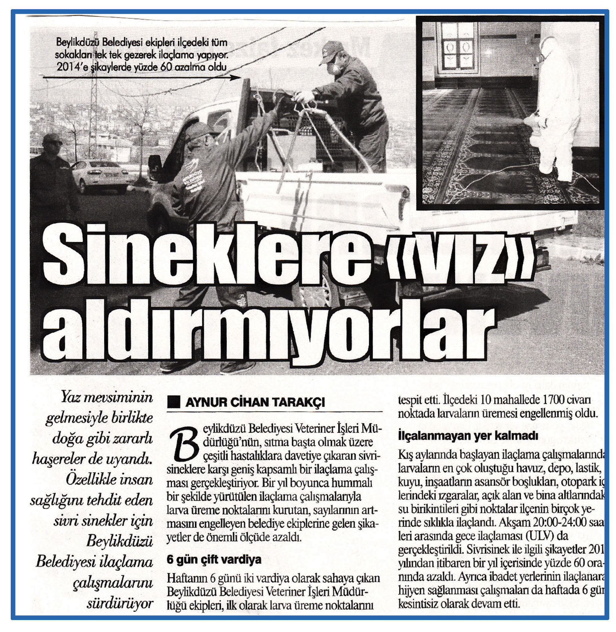 24 Temmuz 2015 tarihli ''GAZETE İSTANBUL'' gazetesi. Beylikdüzü Belediyesi Veteriner İşleri Müdürlüğü'nün, sıtma başta olmak üzere çeşitli hastalıklara davetiye çıkaran sivrisineklere karşı geniş kapsamlı bir ilaçlama çalışması gerçekleştiriyor.Bir yıl boyunca hummalı bir şekilde yürütülen ilaçlama çalışmalarıyla larva üreme noktalarını kurutan,sayılarının artmasını engelleyen belediye ekiplerine gelen şikayetler de önemli ölçüde azaldı.