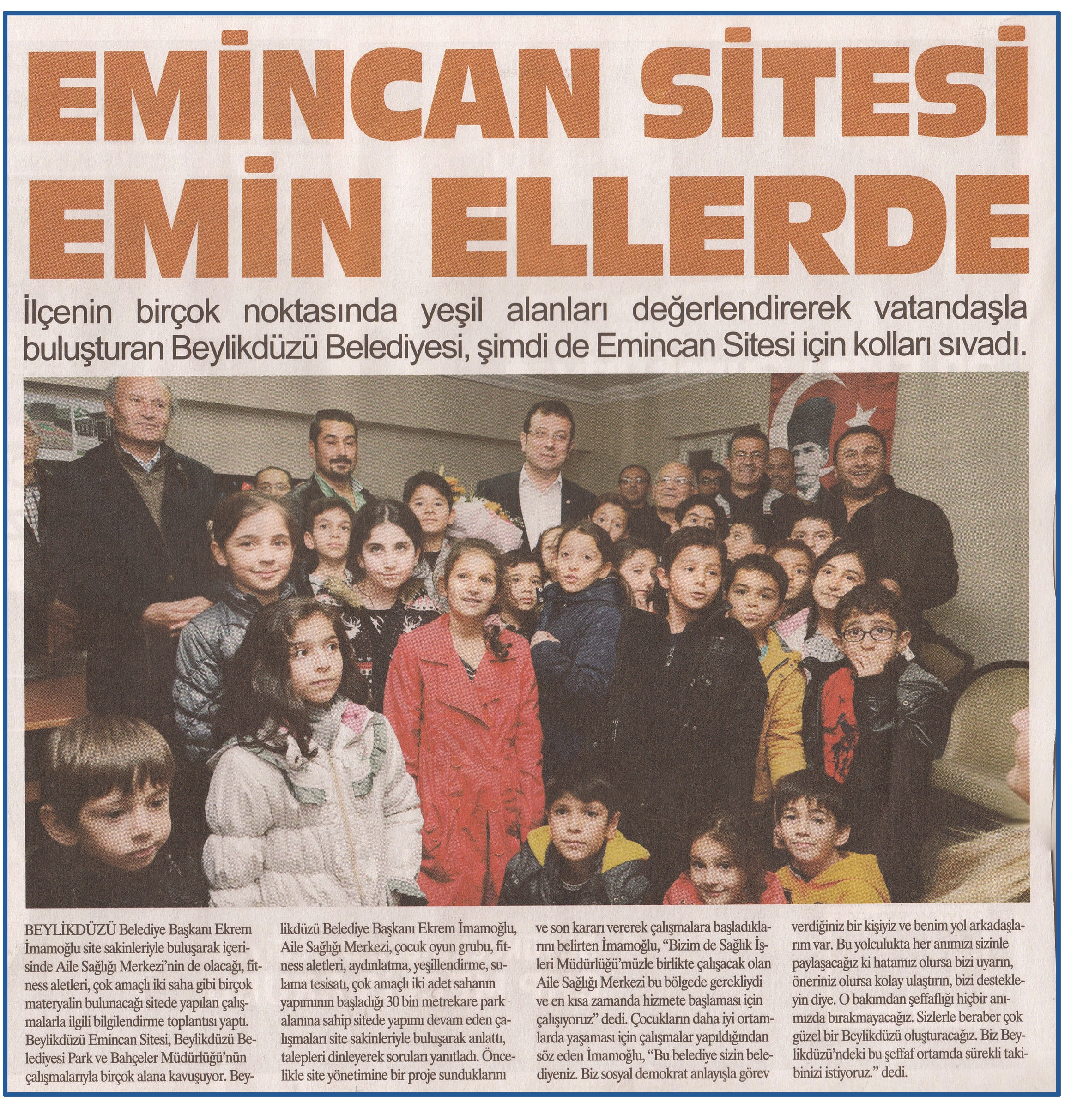 2 Kasım 2015 tarihli "HABERCİ" gazetesi. İlçenin birçok noktasında yeşil alanları değerlendirerek vatandaşla buluşturan Beylikdüzü Belediyesi, şimdi de Emincan Sitesi için kolları sıvadı.