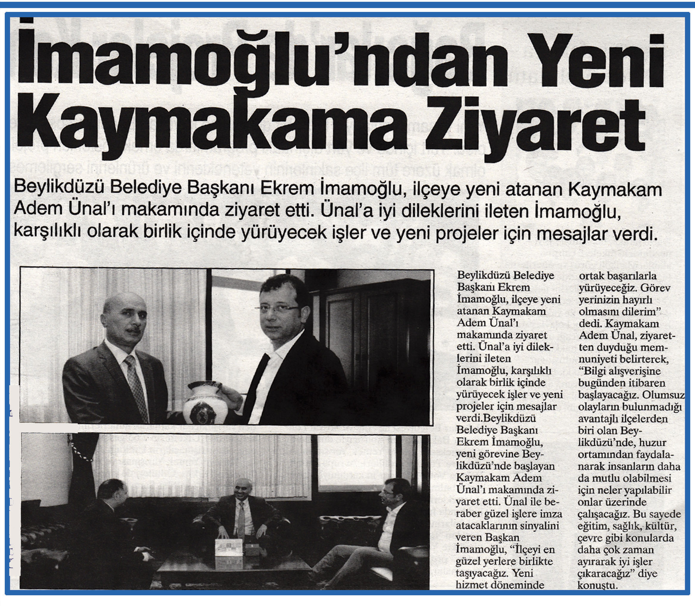 14 Ağustos 2015 tarihli ''NABIZ'' gazetesi. Beylikdüzü Belelediye Başkanı Ekrem İmamoğlu,ilçeye yeni atanan Kaymakam Adem Ünal'ı makamında ziyaret etti. Ünal'a iyi dileklerini ileten İmamoğlu,karşılıklı olarak birlik içinde yürüyecek işler ve yeni projeler için mesajlar verdi.