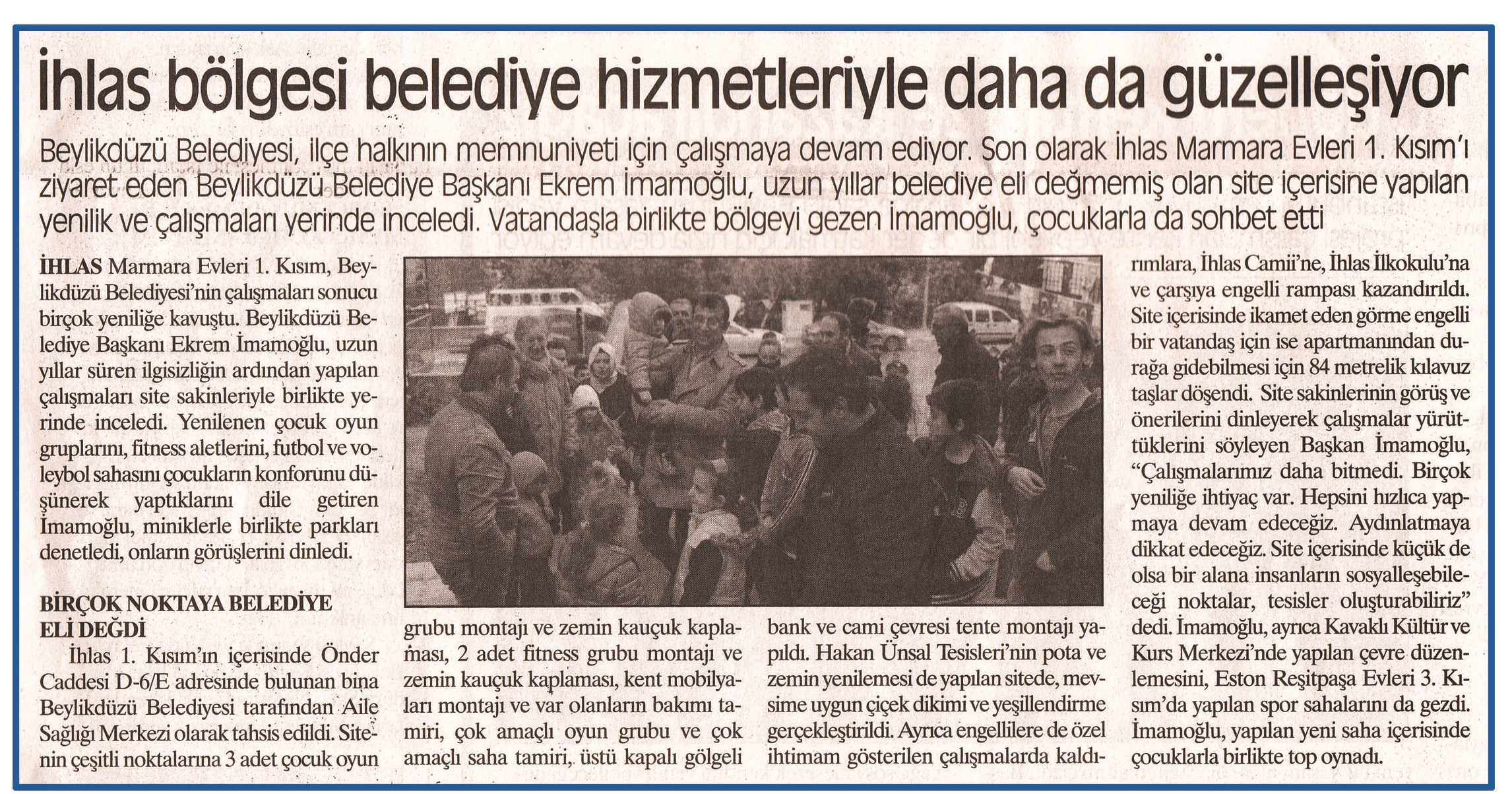 3 Kasım 2015 tarihli "DEĞİŞİM" gazetesi. Beylikdüzü Belediyesi, ilçe halkının memnuniyeti için çalışmaya devam ediyor. Son olarak İhlas Marmara Evleri 1. Kısım'ı ziyaret eden Beylikdüzü Belediye Başkanı Ekrem İmamoğlu, uzun yıllar belediye eli değmemiş olan site içerisine yapılan yenilik ve çalışmaları yerinde inceledi.