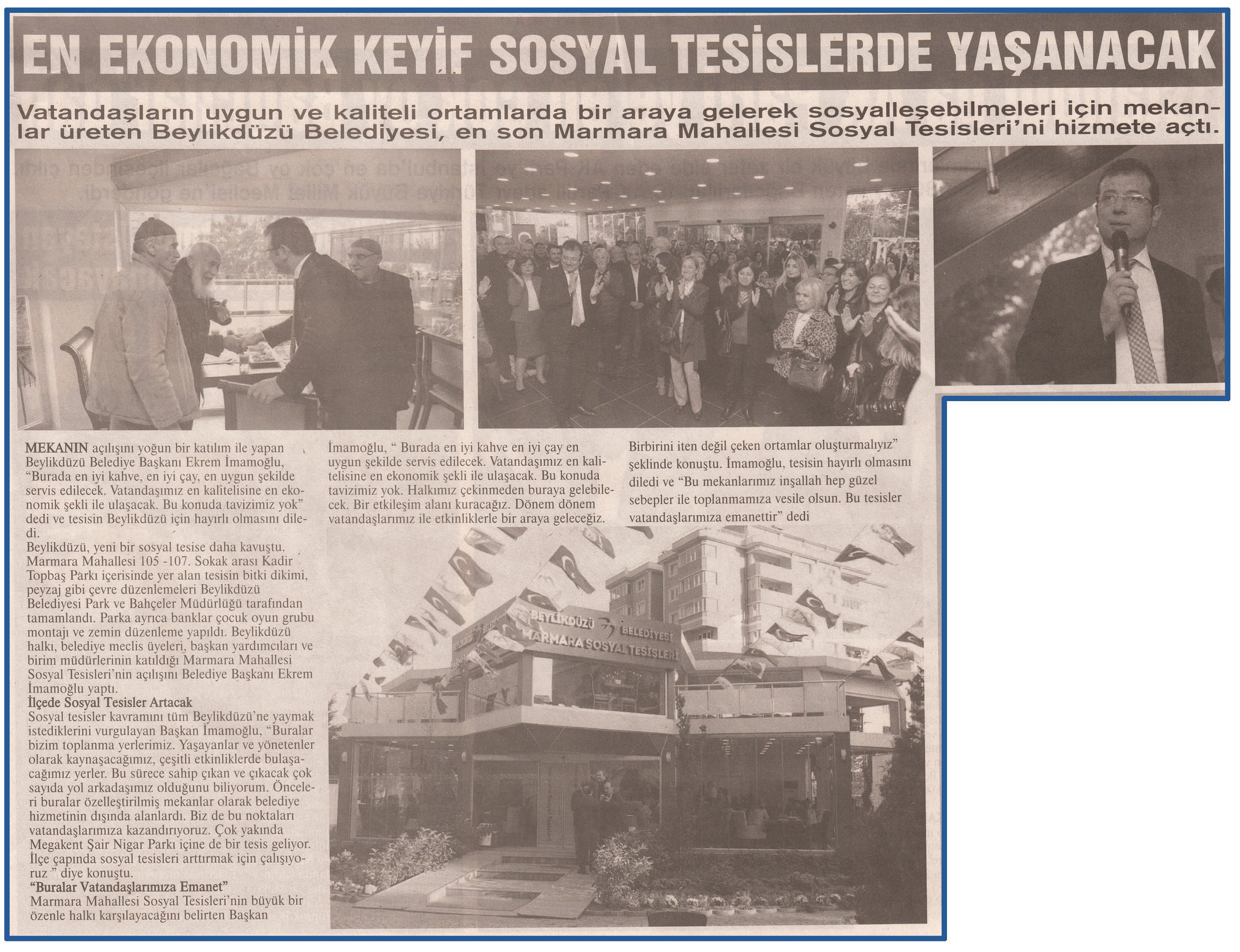 3 Kasım 2015 tarihl "MARMARA" gazetesi. Vatandaşları uygun ve kaliteli ortamlarda bir araya gelerek sosyalleşebilmeleri için mekanlar üreten Beylikdüzü Belediyesi, en son Marmara Mahallesi Sosyal Tesisleri'ni hizmete açtı.