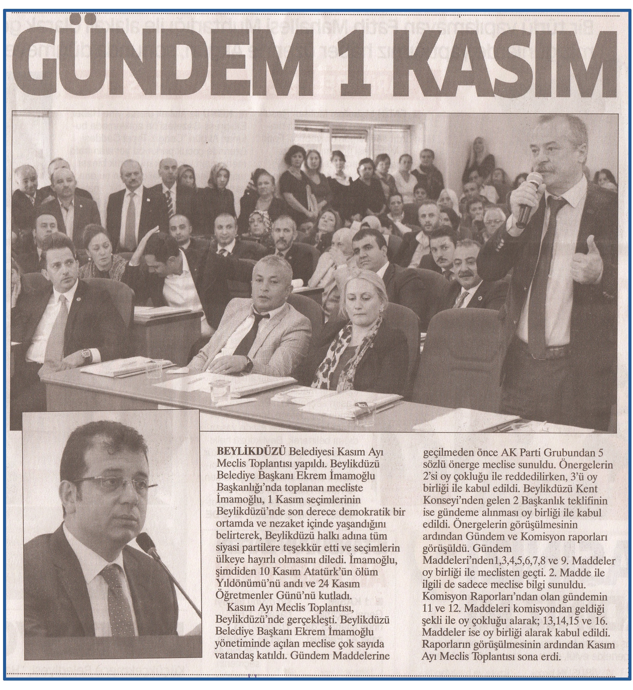 4 Kasım 2015 tarihli "HABER EKSPRESS" gazetesi. Beylikdüzü Belediyesi Kasım Ayı Meclis Toplantısı yapıldı. Beylikdüzü Belediye Başkanı Ekrem İmamoğlu Başkanlığı'nda toplanan mecliste İmamoğlu, 1 Kasım seçimlerinin Beylikdüzü'nde son derece demokratik bir ortamda ve nezaket içinde yaşandığını belirterek, Beylikdüzü halkı adına tüm siyasi partilere teşekkür etti ve seçimlerin ülkeye hayırlı olmasını diledi.